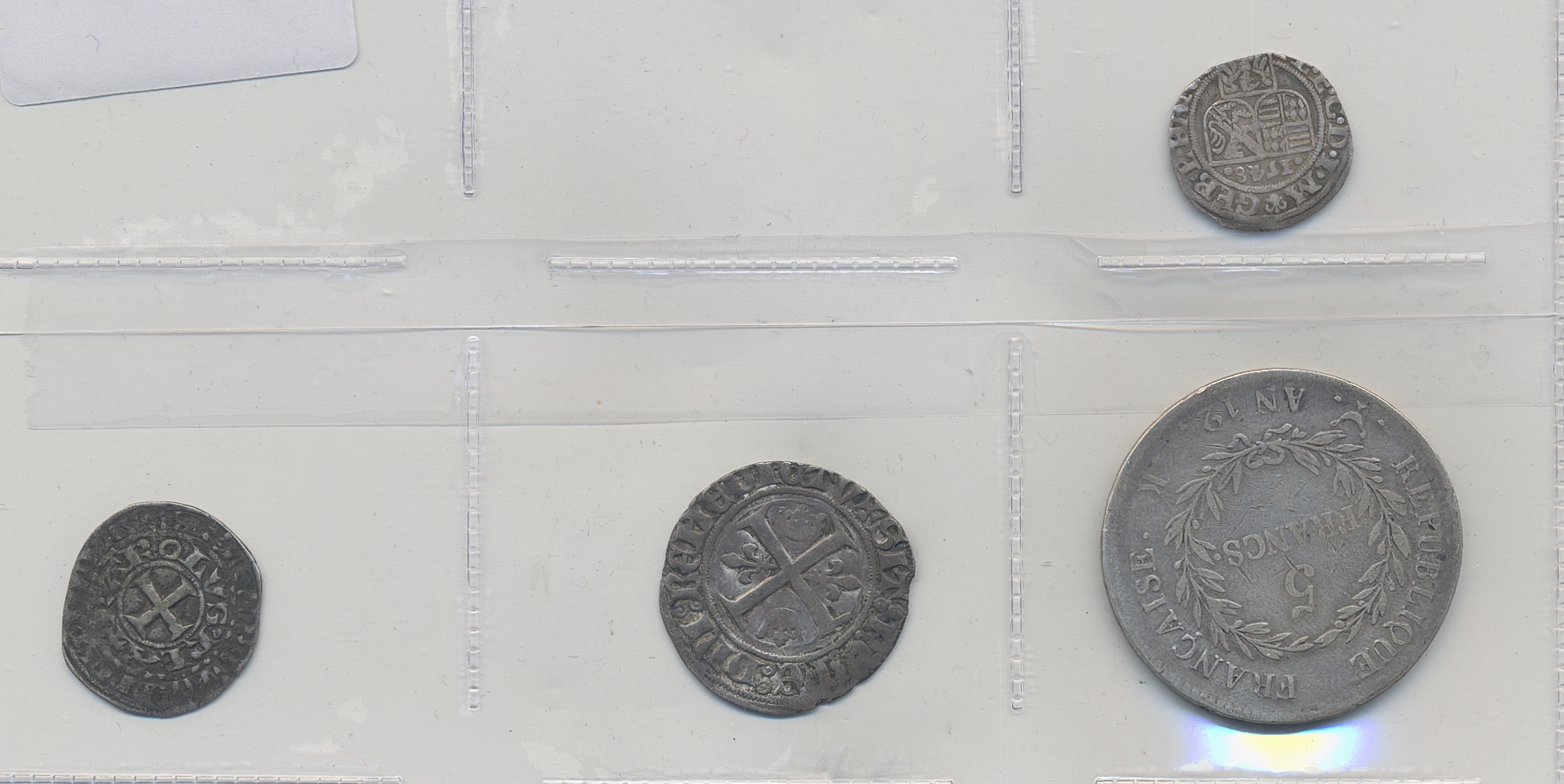 Coins, Europe. Three European medieval coins (two French, one German) and a France 5 francs An 12 Bordeaux mint. Please inspect! F-VF.