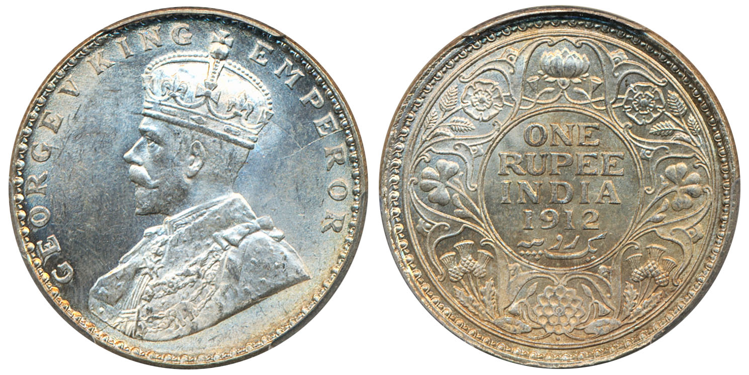 Coins, India. George V (1910-36), KM 524, 1 rupee 1912. Bombay mint. Graded by PCGS as MS64. XF-UNC. See certification at PCGS