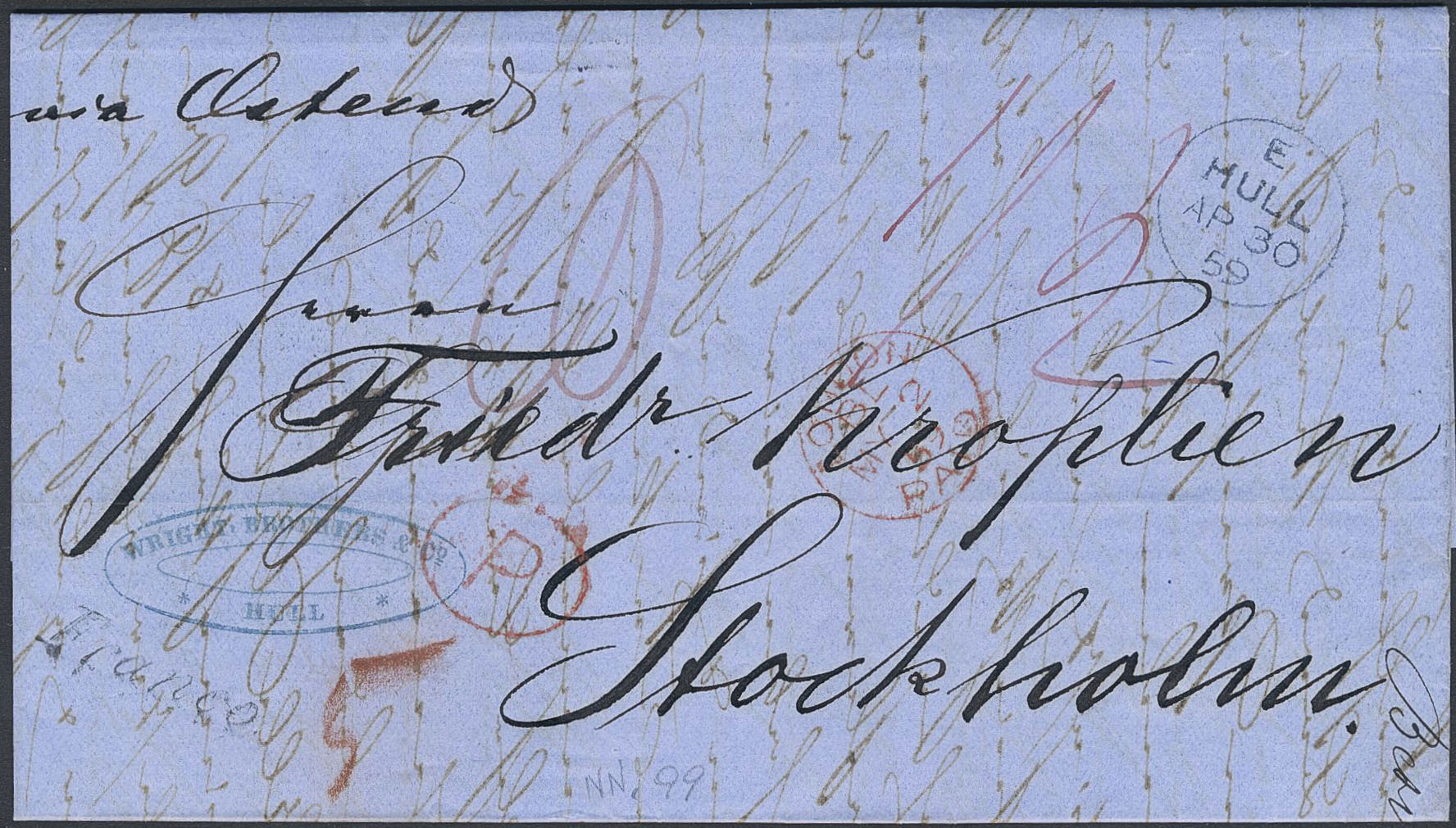 Sweden. Foreign-related cover. Great Britain. Letter sent from HULL 30.AP.59 "via Ostende" to Stockholm. Cancellations e.g. LONDON PAID 2.MY.59, P, FRANCO and KSPA HAMBURG 5.5.1859.