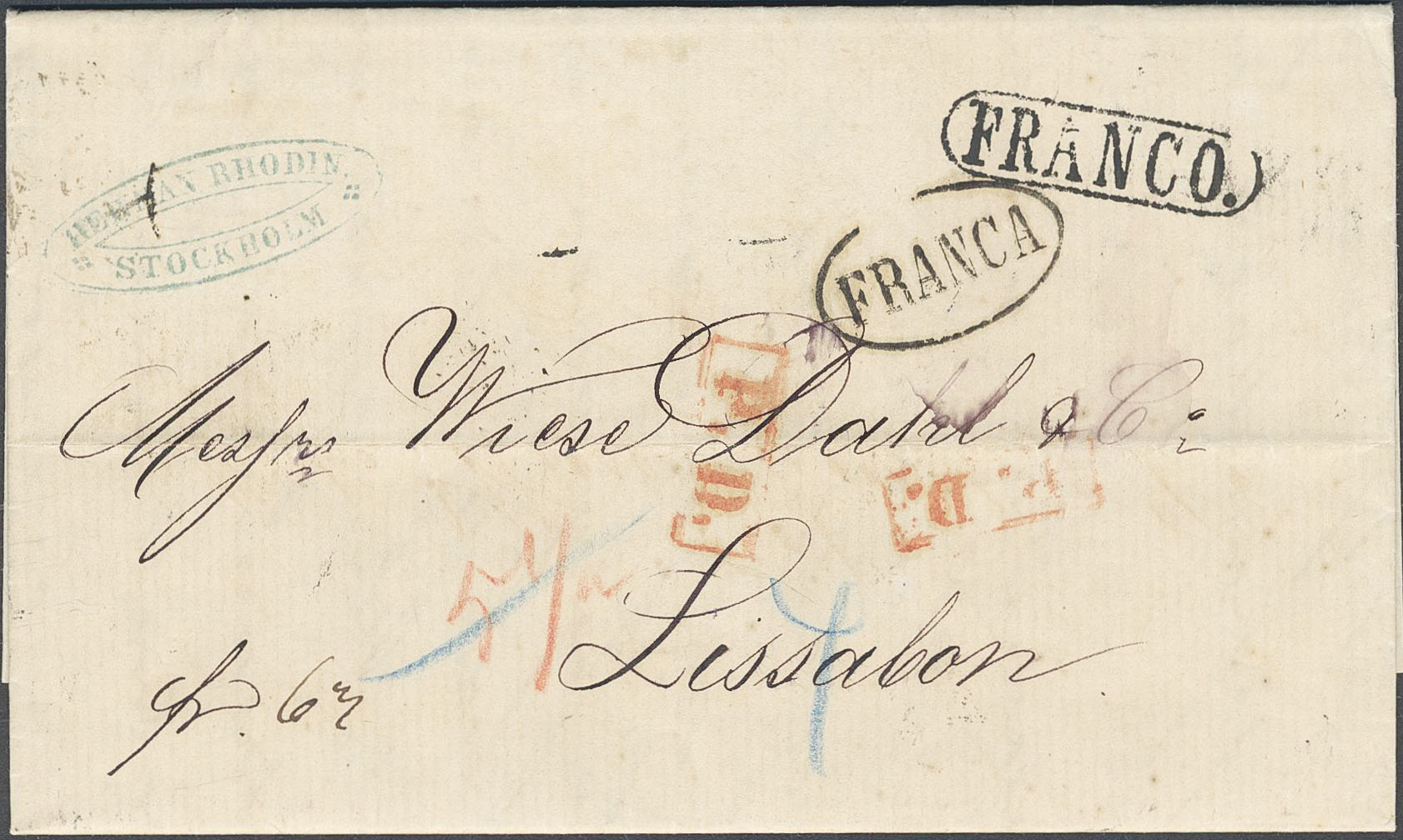 Sweden. Foreign-related cover. Portugal. Prepaid letter dated "Kongl. Spanska Vice-Consulatet Stockholm d. 20 April 1872", sent via Stralsund, in German closed mail to Madrid and via Baajoz to Lisbon. Prepaid postage 63 öre. Cancellations FRANCO, P.D., FRANCA and LISBOA 28.4.1872. Superb and scarce. Ex. Nilsson.