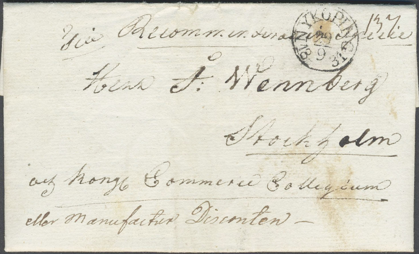 Sweden. Prephilately, collection C/D COUNTIES on visir leaves. Selected better items: Arc pmks ENKÖPING type 2 (P: 800) and type 3 (P: 800), NYKÖPING type 1 in two copies (P: 800 each), STRENGNÄS type 3 in two copies (P: 600 each), TROSA type 1 (P: 1500), UPSALA type 3, and rectangular pmks ESKILSTUNA type 2 (P: 600), MORA type 3 and NYKÖPING type 1 (P: 500). The two latter sent durig the sk bco stamp period. Two covers are sent registered. The entire lot is presented at www.philea.se. Very fine–superb quality. (9)