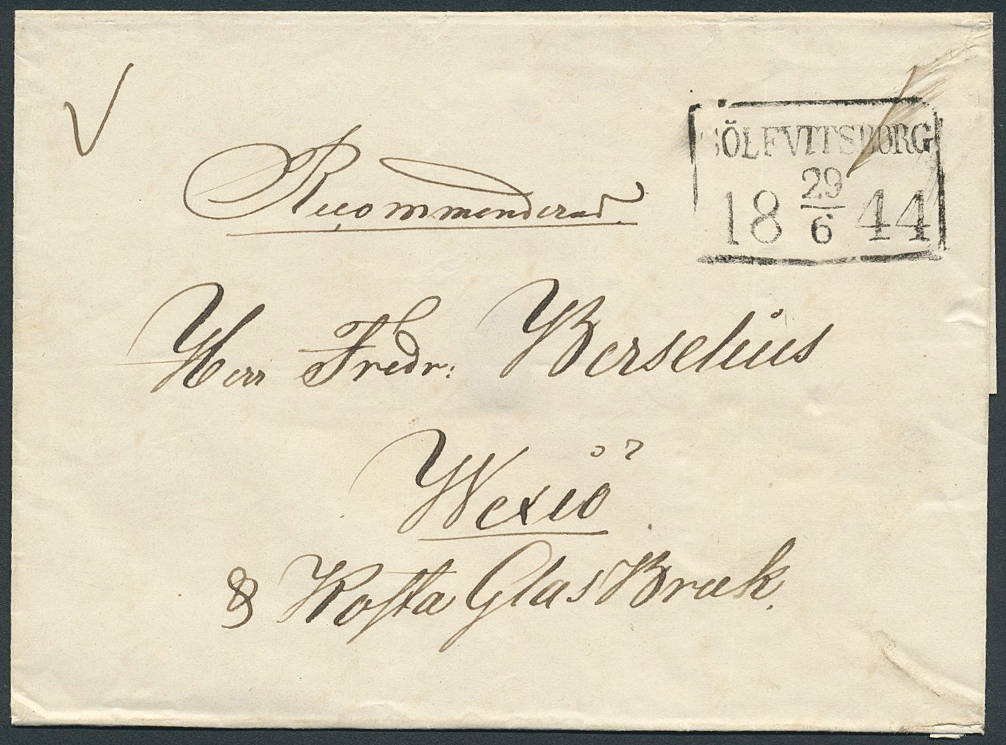 Sweden. Prephilately, collection K COUNTY on visir leaves. Selected better items: Arc pmks CARLSCRONA type 2, CARLSCRONA type 4 in two copies, CARLSHAMN type 1 in four copies (P: 800 each), RUNNEBY type 1 in three copies (P: 1200 each), rectangular pmks CARLSKRONA type 1 in three copies, type 2 (P: 600), type 3 in two copies (P: 1000 each) and type 6 in four copies, and SÖLFVITSBORG type 1 in two copies (P: 800 each). The entire lot is presented at www.philea.se. Fine–superb quality. (22)