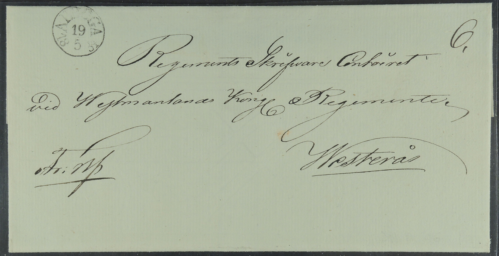 Sweden. Prephilately, collection U COUNTY on visir leaves. Selected better items: Arc pmks ARBOGA type 2 (P: 600), KÖPING type 1 (P: 500 each) and 2 (P: 800), SALA type 1 (P: 600), WESTERÅS type 1 (P: 500) and type 2 in two copies (P: 600 each), and rectangular pmk STRÖMSHOLM sent during the sk bco stamp period. The entire lot is presented at www.philea.se. Very fine–superb quality. (8)
