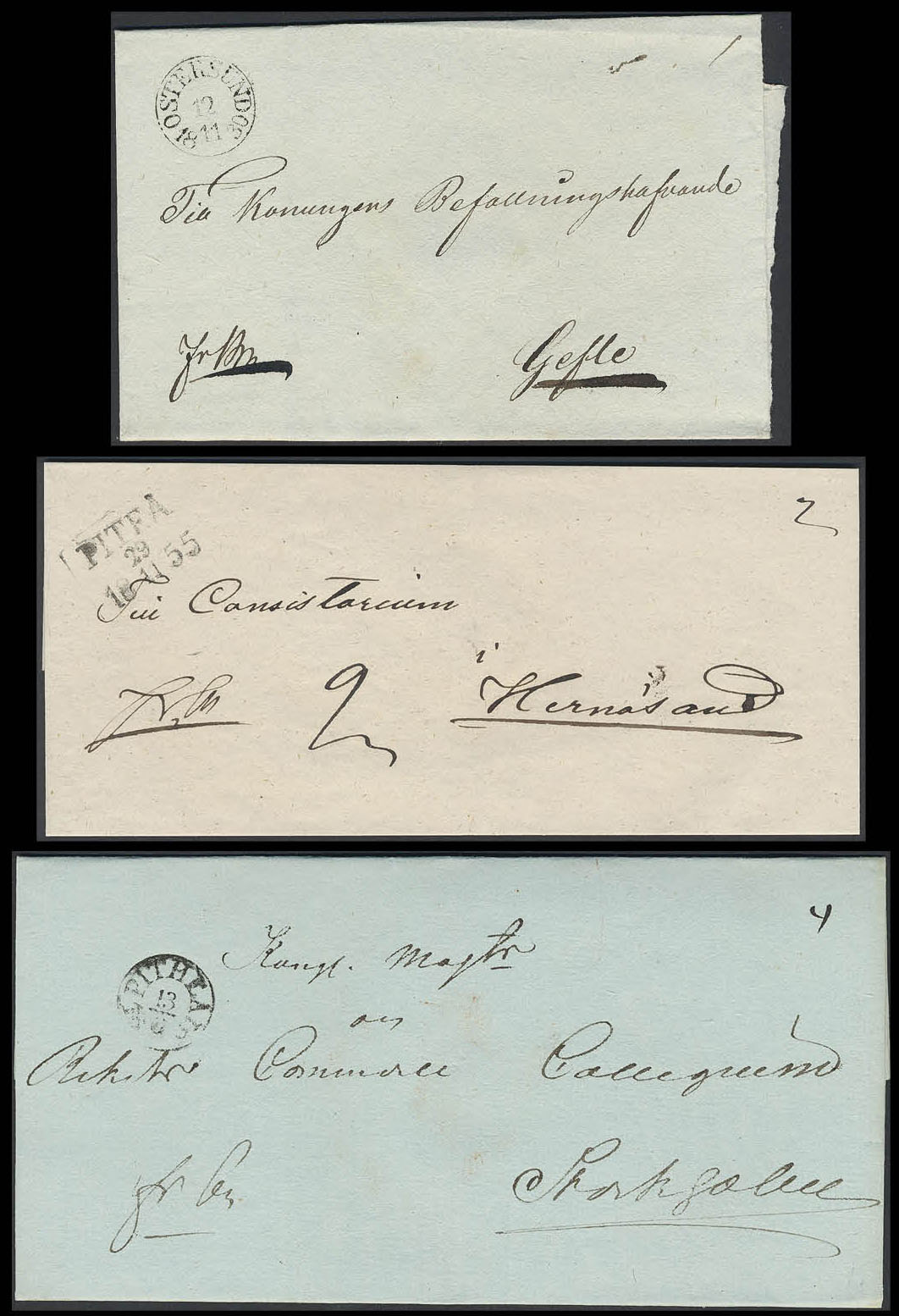Sweden. Prephilately, collection Z/BD COUNTIES on visir leaves. Selected better items: Arc pmks PITHEÅ type 1 (P: 1500), ÖSTERSUND type 1 (P: 500), and rectangular pmk PITEÅ type 3 sent during the sk bco stamp period. The entire lot is presented at www.philea.se. Very fine–superb quality. (3)