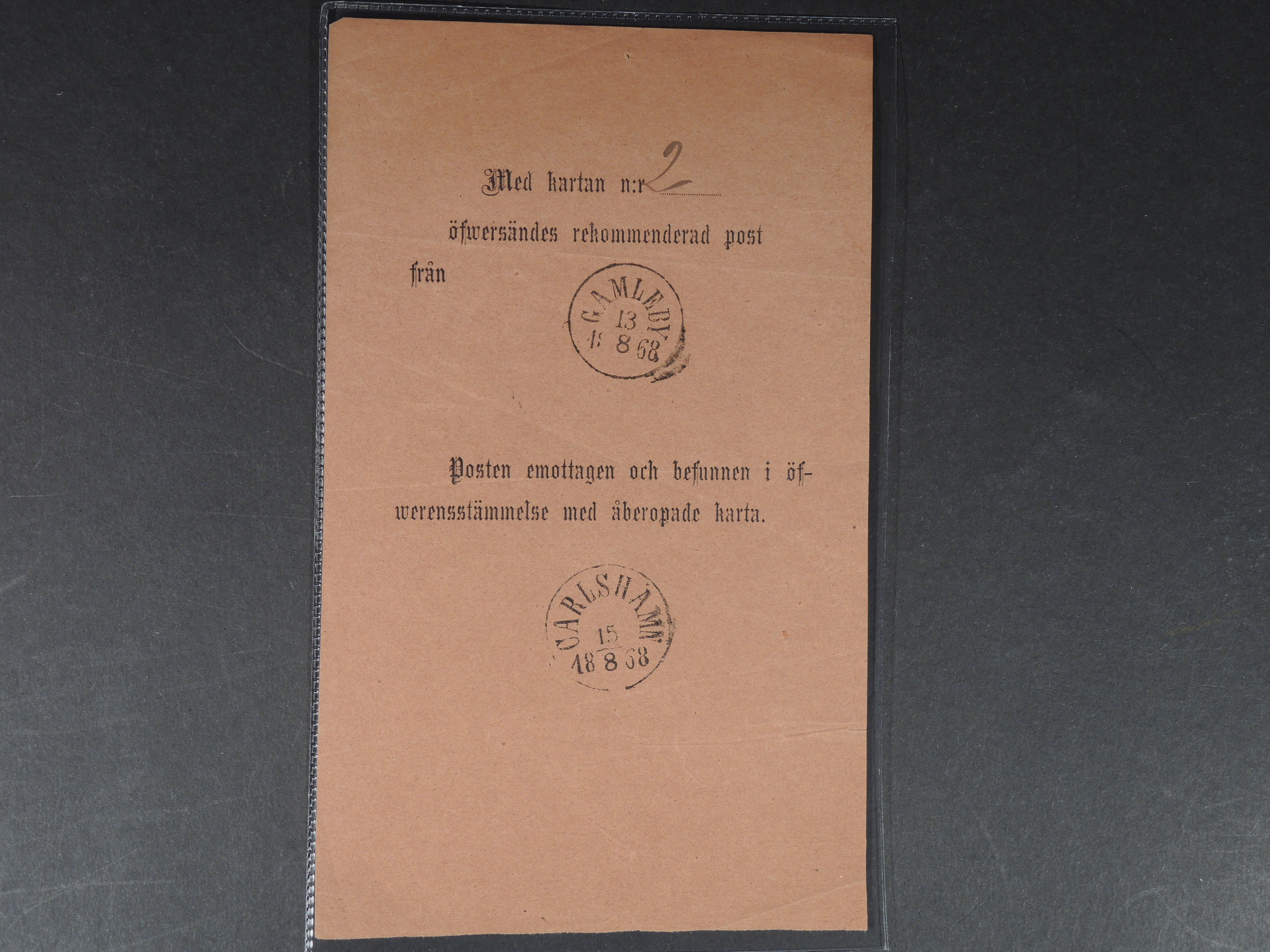 Sweden. Postal form. Unnumbered form, letter list for mail sent between GAMLEBY 13.8.1868 and CARLSHAMN 15.8.1868.