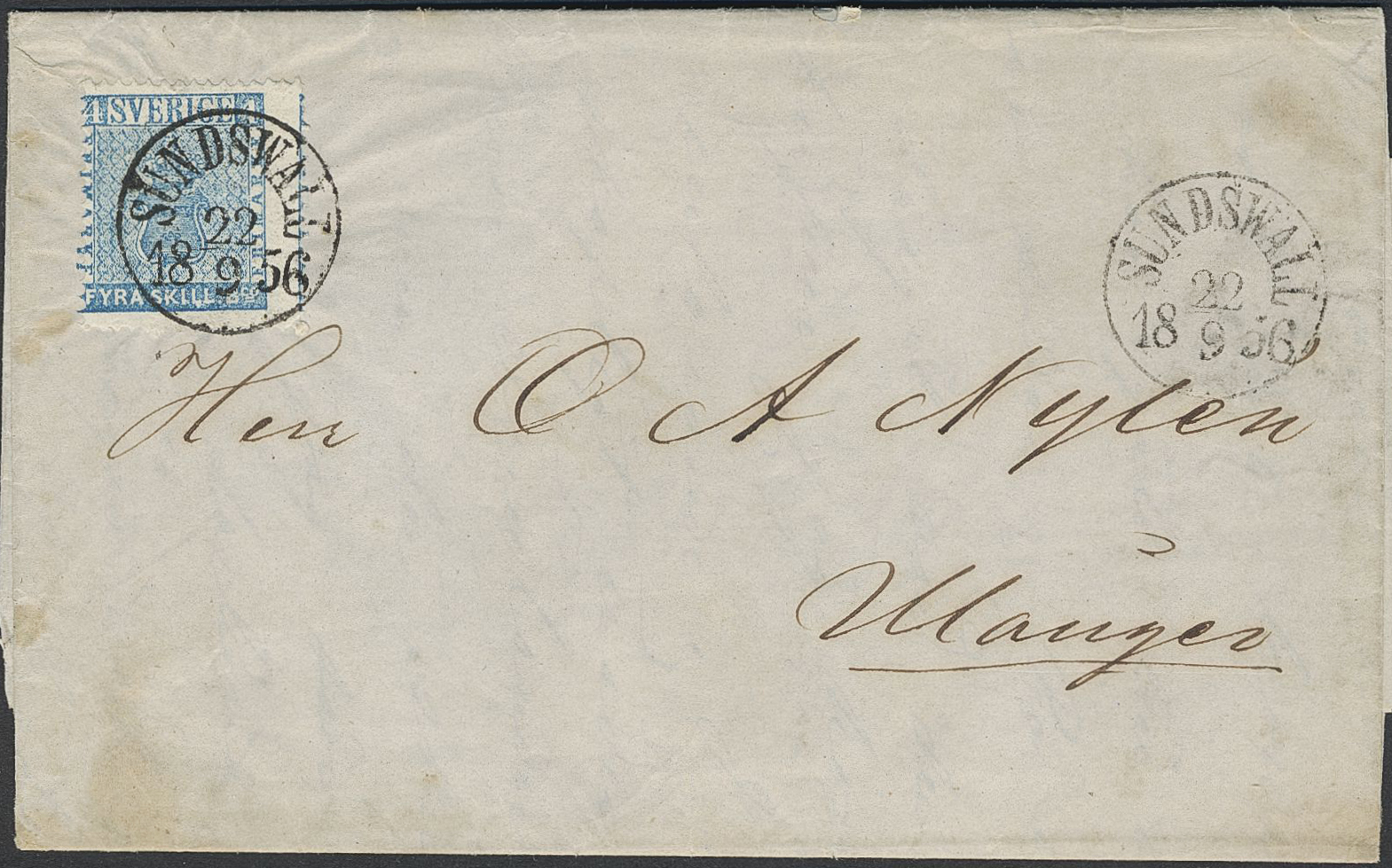 Sweden. Facit 2v on cover, 4 skill blue with variety parts of two stamps, on beautiful cover sent from SUNDSWALL 22.9.1856 to Ullånger.