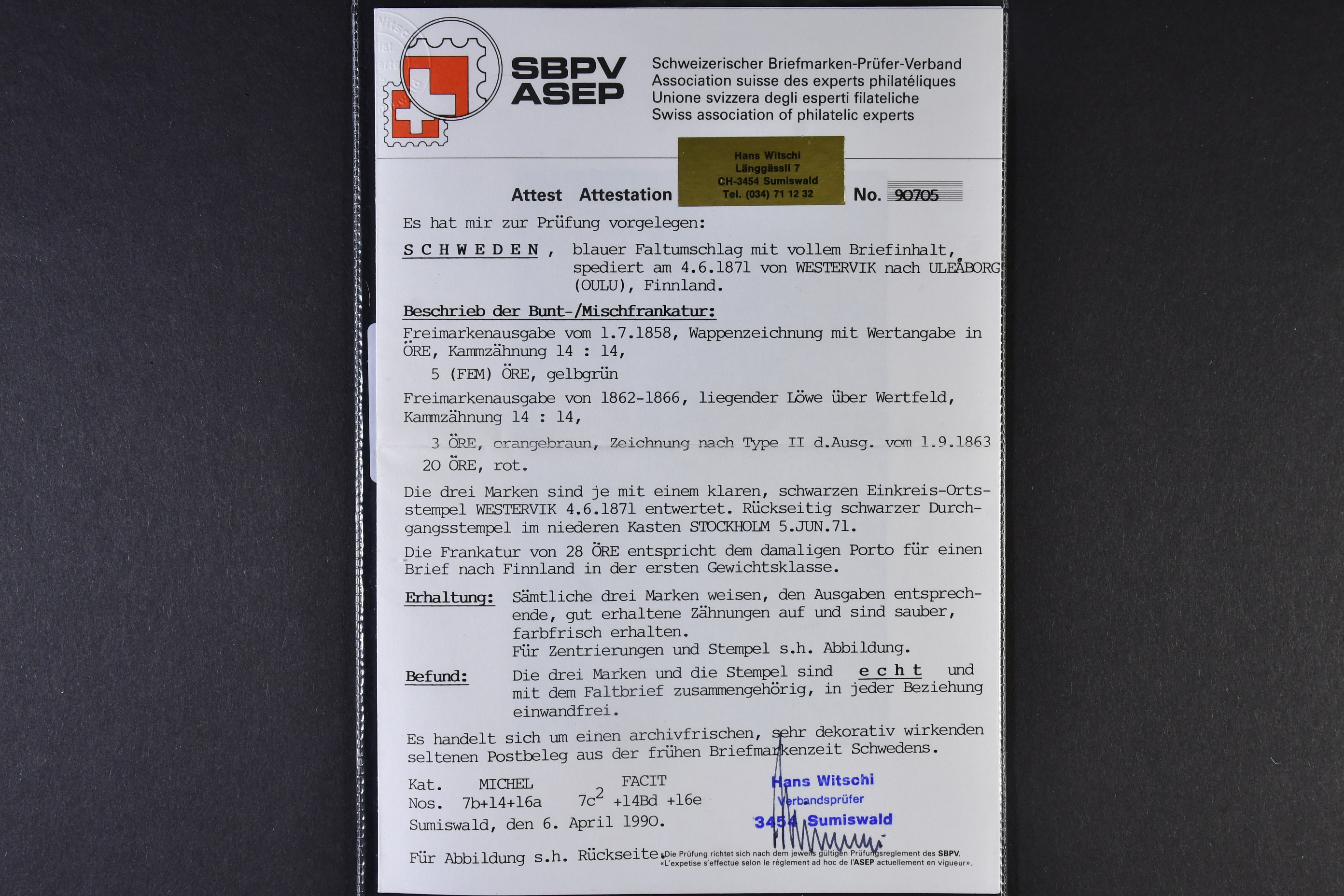 Sweden. Facit 7, 14B, 16 on cover, 3+5+20 öre on beautiful cover sent from WESTERVIK 4.6.1871 to Finland. Transit pmk STOCKHOLM 5.JUN.71. Traces of tape on reverse. Certificate Witschi (1990).