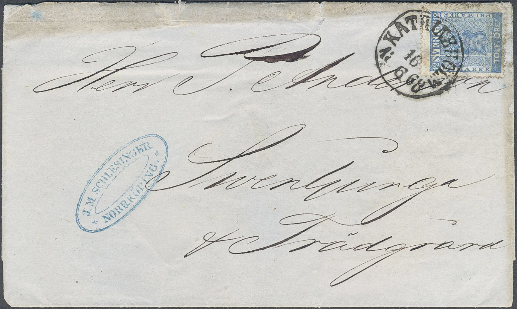 Sweden. Facit 9v6 on cover, 12 öre blue, “EXCLAMATION MARK” (Utropstecknet) variety (pos 53 in plate VI) on letter with notation "Prof." and with preserved cloth sample inside. Sent from KATRINEHOLM 16.6.1868 to Svenljunga. Some imperfections. Only a few examples of this scarce and sought-after variety on cover are recorded, as well as only a few samples are recorded from the CoA period. Ex. Michtner.