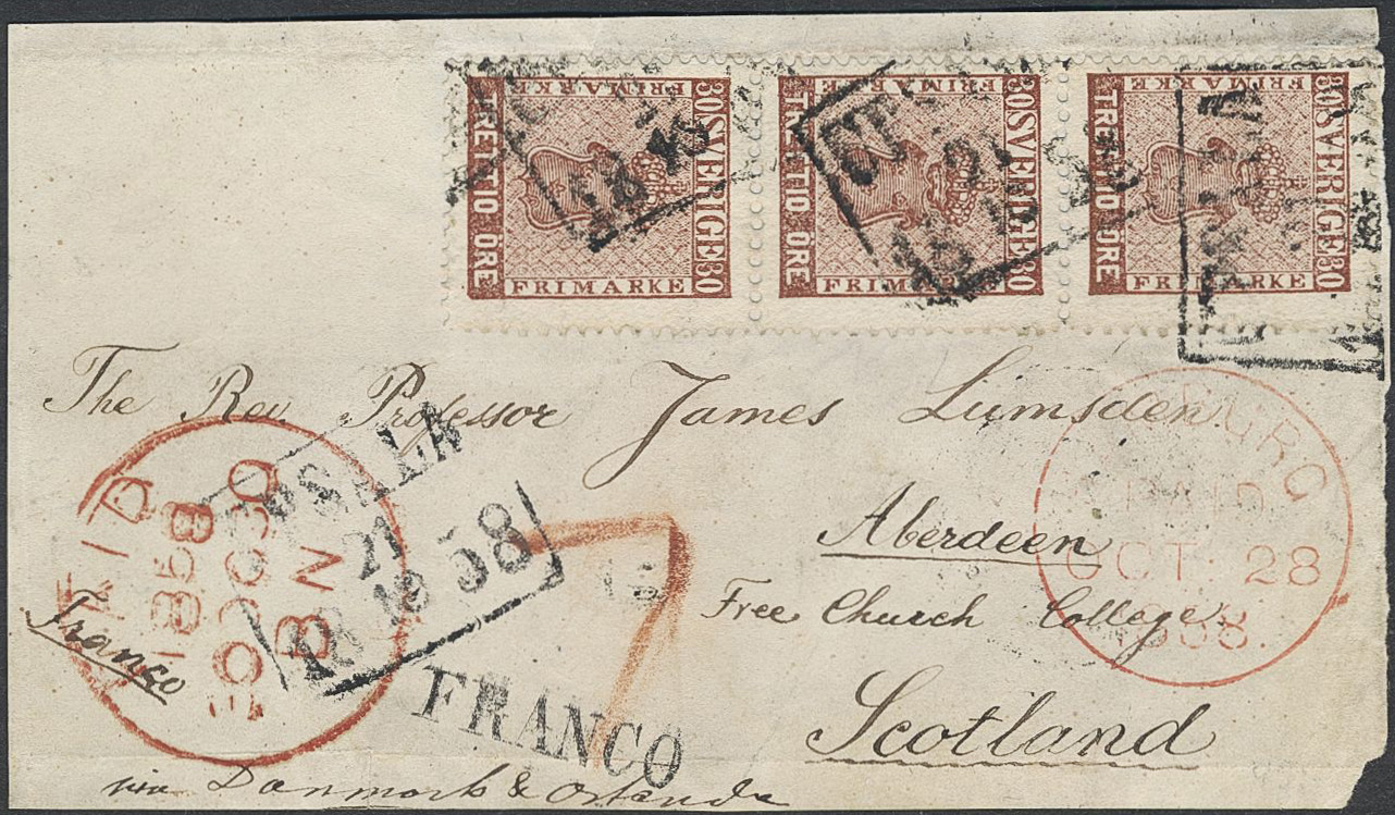 Sweden. Facit 11 on piece, 3×30 öre in strip of three + (2×F8 missing) as rate 108 öre on cover front sent from UPSALA 21.10.1858 "via Danmark & Ostende" to Great Britain. Transit HAMBURG 28.OCT.1858 and arrival pmk PAID BN 30.OC.1858.