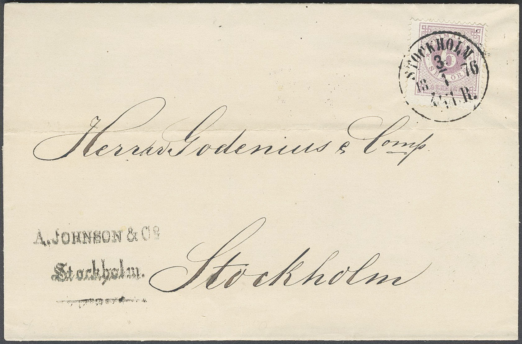 Sweden. Facit 20j on cover, 6 öre lilac on beautiful local cover cancelled STOCKHOLM 1.TUR 3.1.1876. Unusually early TUR-cancel with year. Superb.