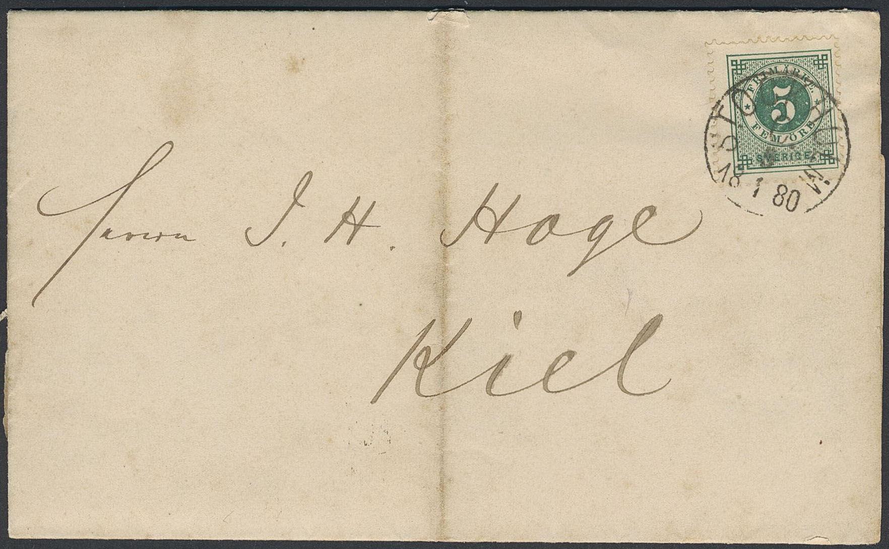 Sweden. Facit 30b on cover, 5 öre dull bluish green on scarce printed matter sent from STOCKHOLM C 5.1.1880 to Germany. Arrival pmk KIEL 1 7.1.80. A few somewhat short perfs. EARLIEST recorded 5 öre pm rate usage to Germany.