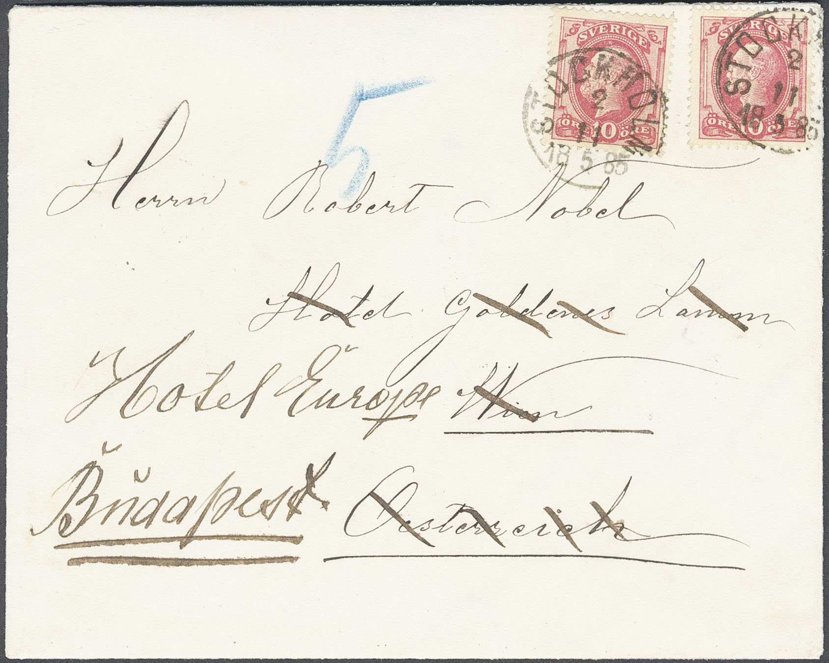 Sweden. Facit 39 on cover, 2×10 öre on cover sent from STOCKHOLM 11.5.1885 to Austria, then forwarded to Hungary, with arrival pmks at back. Scarce destination during this period.