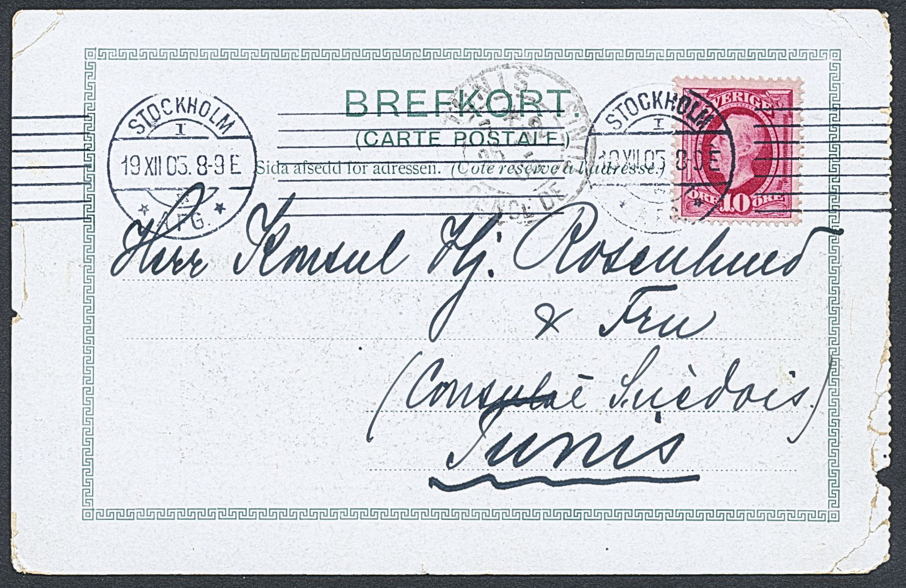 Sweden. Facit 54 on cover, 10 öre on postcard sent from STOCKHOLM 19.XII.05 to Tunisia. Arrival pmk TUNIS 26.12.05. Somewhat edged. Scarce destination, R4 (4–10 recorded covers) according to Facit.
