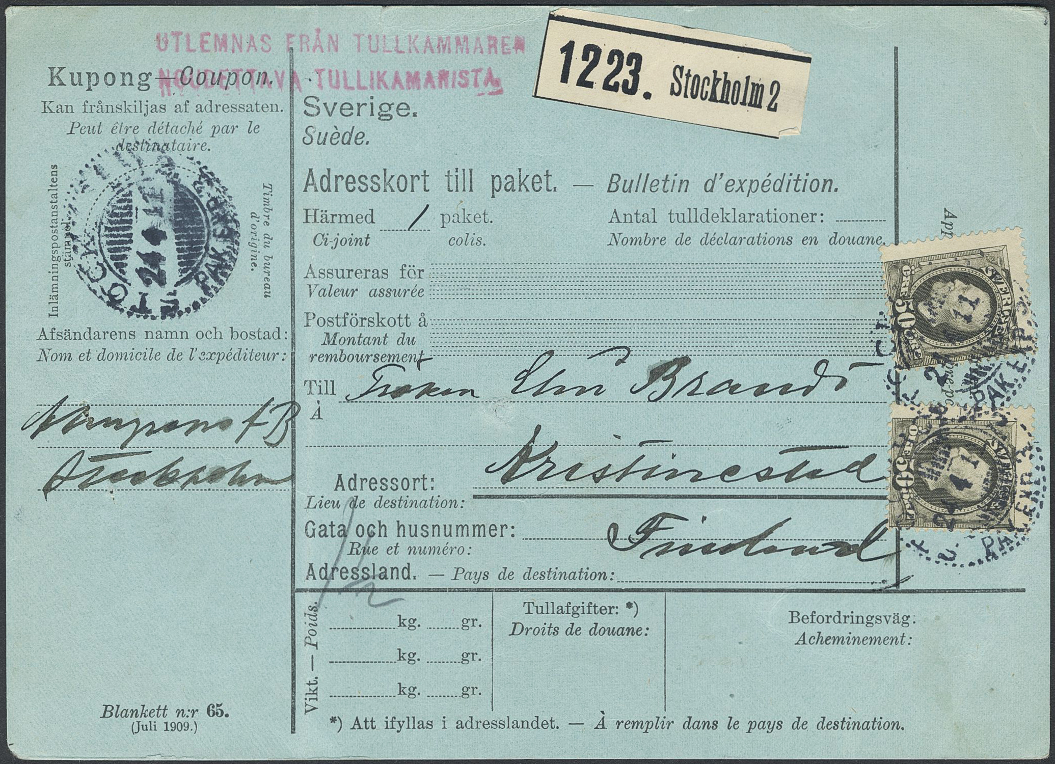 Sweden. Facit 59 on cover, 2×50 öre on address card for parcel sent from STOCKHOLM 2 24.4.11 to Finland. Arrival pmk KRISTINESTAD KRISTIINA 27.IV.11.
