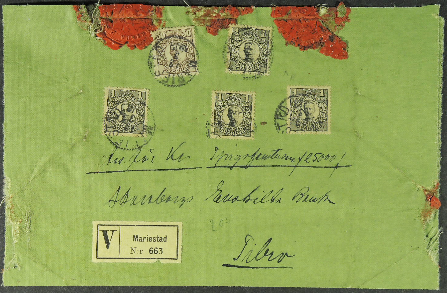 Sweden. Facit 77, 88 on cover, 2×30 öre + 4×1 kr on insured 3-fold cover (oilcloth) probably containg currency, sent from MARIESTAD 13.3.1918 to TIBRO 14.3.1918. Nice item.