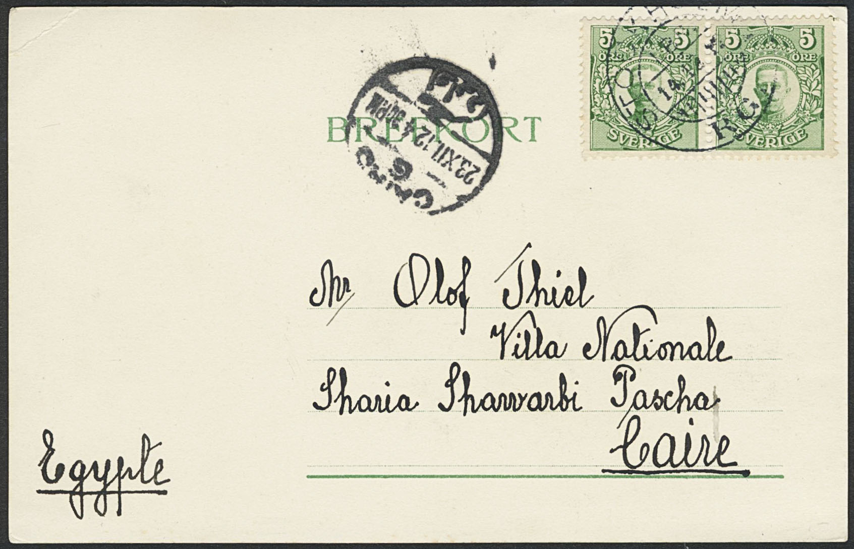 Sweden. Facit 79 on cover, 2×5 öre on beautiful postcard sent from STOCKHOLM RG LBR 14.12.12 to Egypt. Arrival pmk CAIRO 23.XII.12.