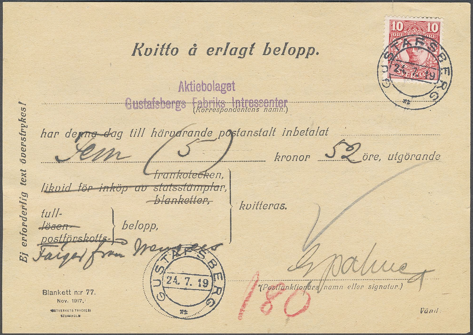 Sweden. Facit 82 on cover, 10 öre on postal form No. 77 (Nov. 1917) cancelled GUSTAFSBERG 24.7.19. Tear in the form repaired at left.