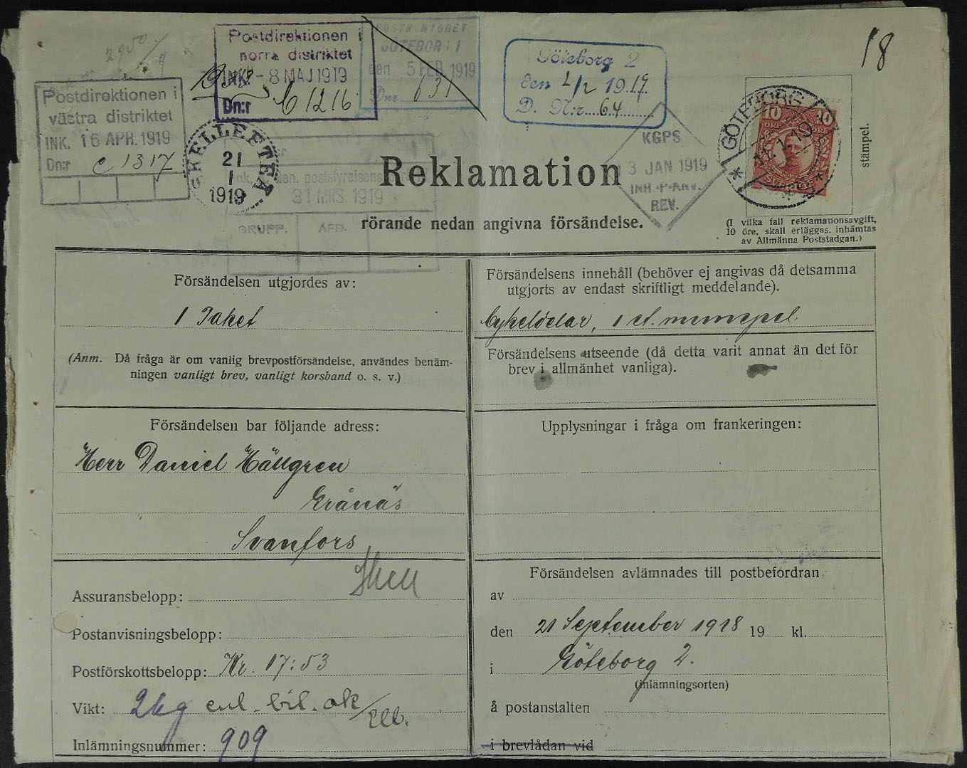 Sweden. Facit 82 on cover, 10 öre on complaint / enquiry regarding a missing cash on delivery parcel addressed to Svanfors. Form No. 329 with cancellations SKELLEFTEÅ 21.1.1919 and SVANFORS 28.8.1919, among other.