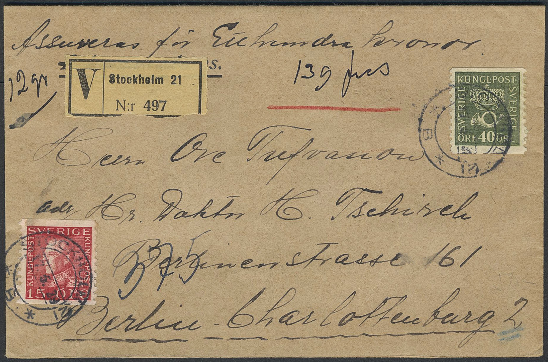 Sweden. Facit 159, 177A on cover, 15+40 öre on insured cover sent from STOCKHOLM 21 17.5.29 to Germany.
