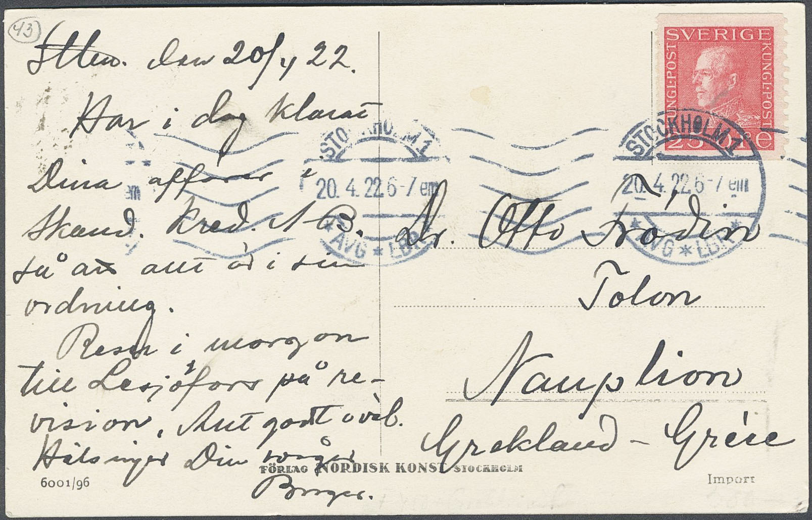 Sweden. Facit 182 on cover, 25 öre on postcard sent from STOCKHOLM 1 20.4.22 to Greece. Scarce.
