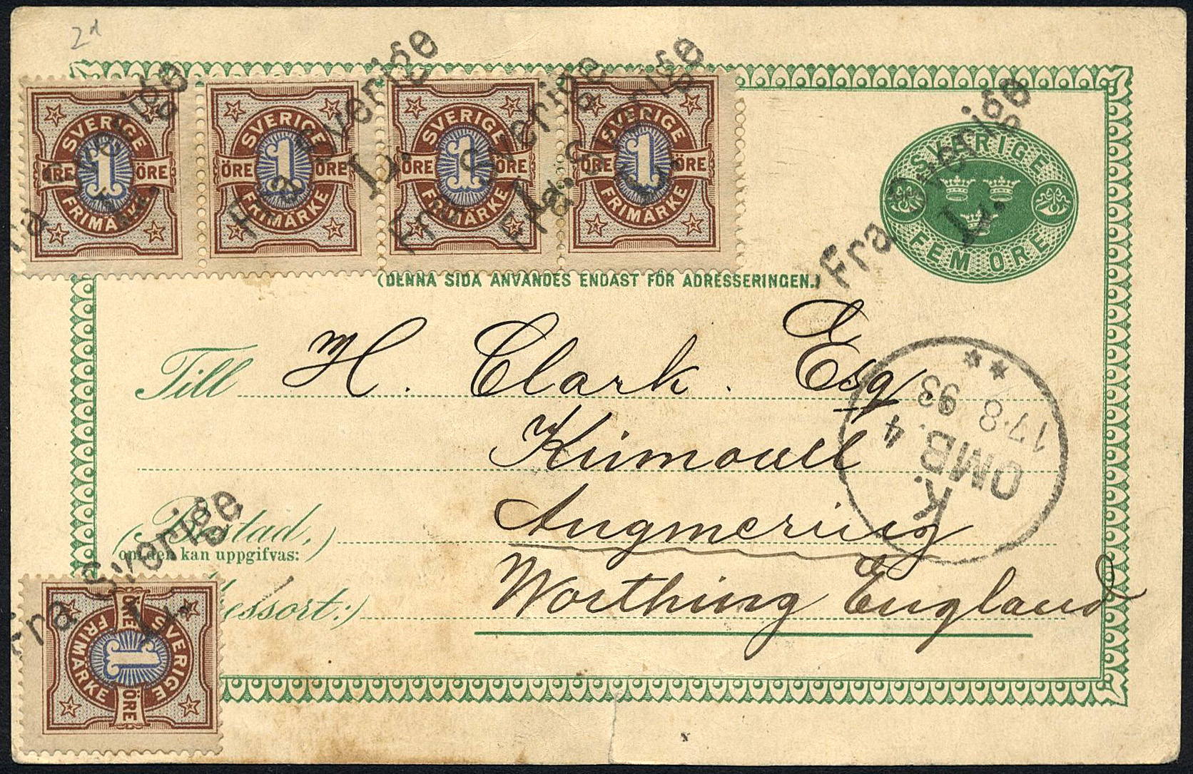 Sweden. Facit bKe7, 61. Cancellations, DENMARK. Danish cancellation FRA SVERIGE L (Landskrona–Copenhagen route) on Swedish stamps 5×1 öre Bi-coloured numeral type on postal stationery card 5 öre. The card (small tear in the bottom) is dated "Landskrona 16/8 93" and sent to Great Britain. Transit pmk K. OMB.4 17.8.93.