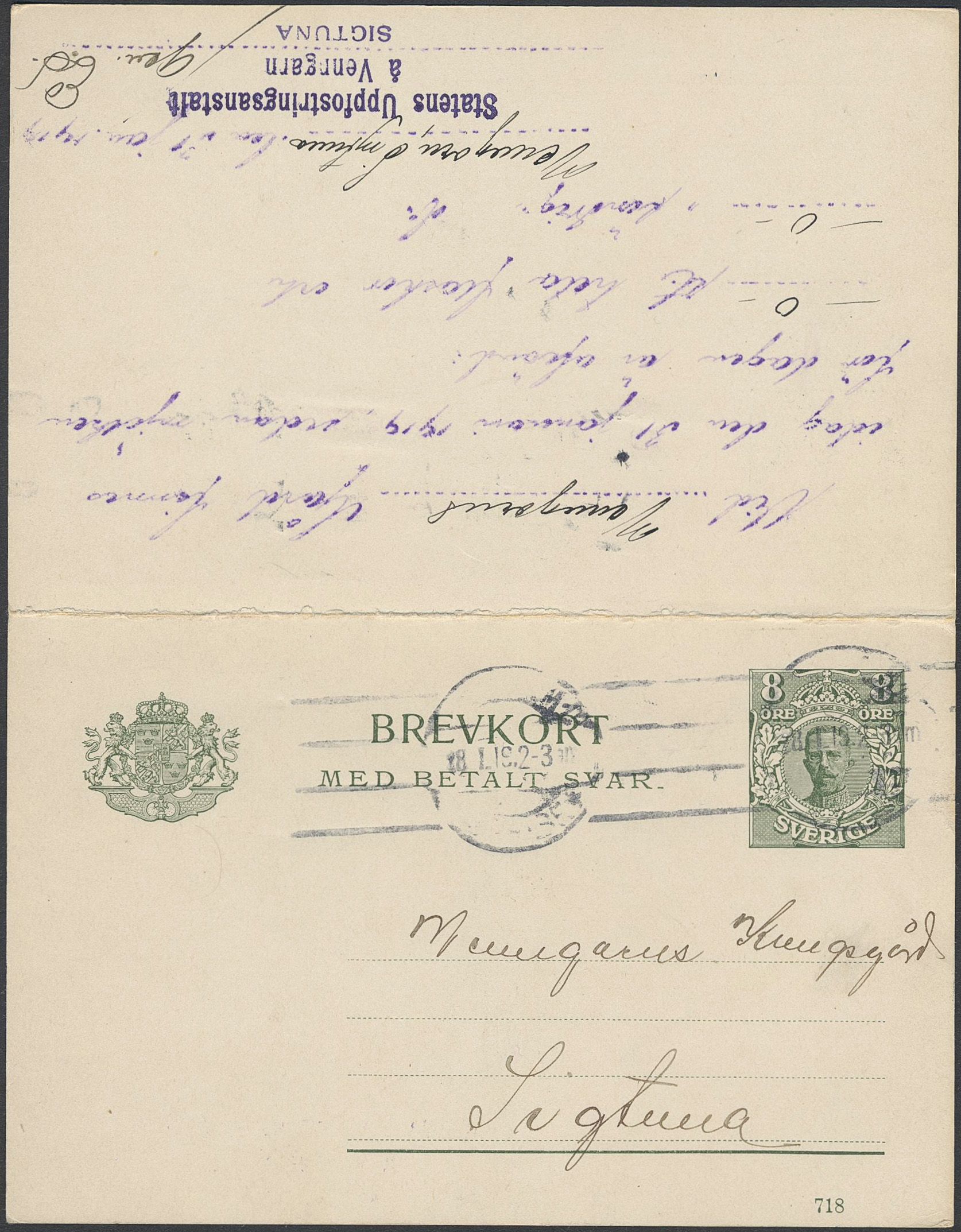 Sweden. Postal stationery, Double postcard, Facit bKd18, Reply-paid postcard 7+8 öre, double usage sent in both directions, the originating card from STOCKHOLM 18.1.19 and the response card from SIGTUNA 31.1.1919. One of the outmost scarcest double usages within Swedish postal stationery.