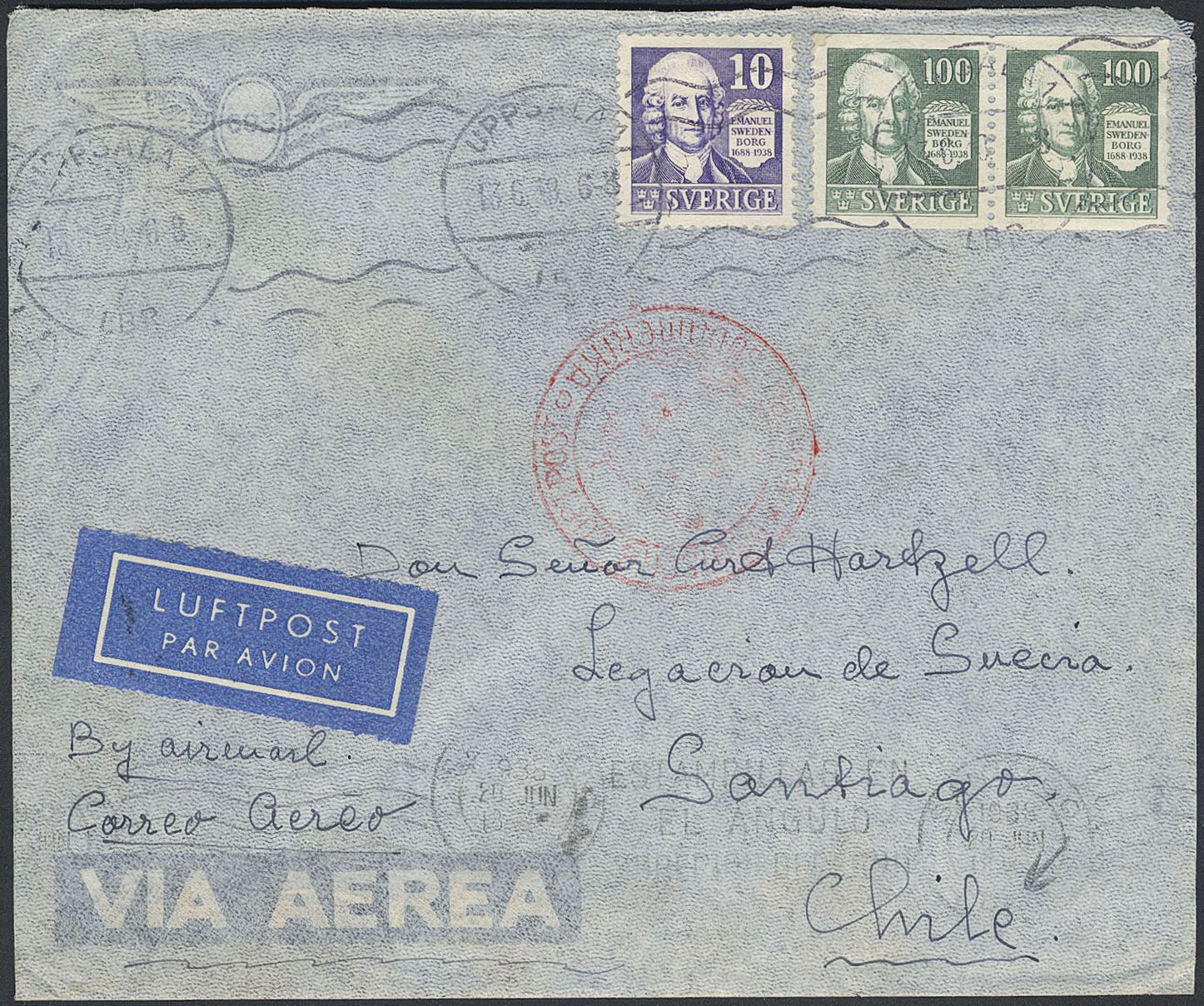 Sweden. Facit 260, 259C on air mail cover, 10+2x100 öre on air mail cover sent from UPPSALA 1 13.6.38 to Chile. Transit pmk BERLIN-SASSNITZ HAFEN BAHNPOST ZUG 18 14.6.38 and arrival SANTIAGO 20.JUN.38. Ex Kvalitetsfilateli 1988.