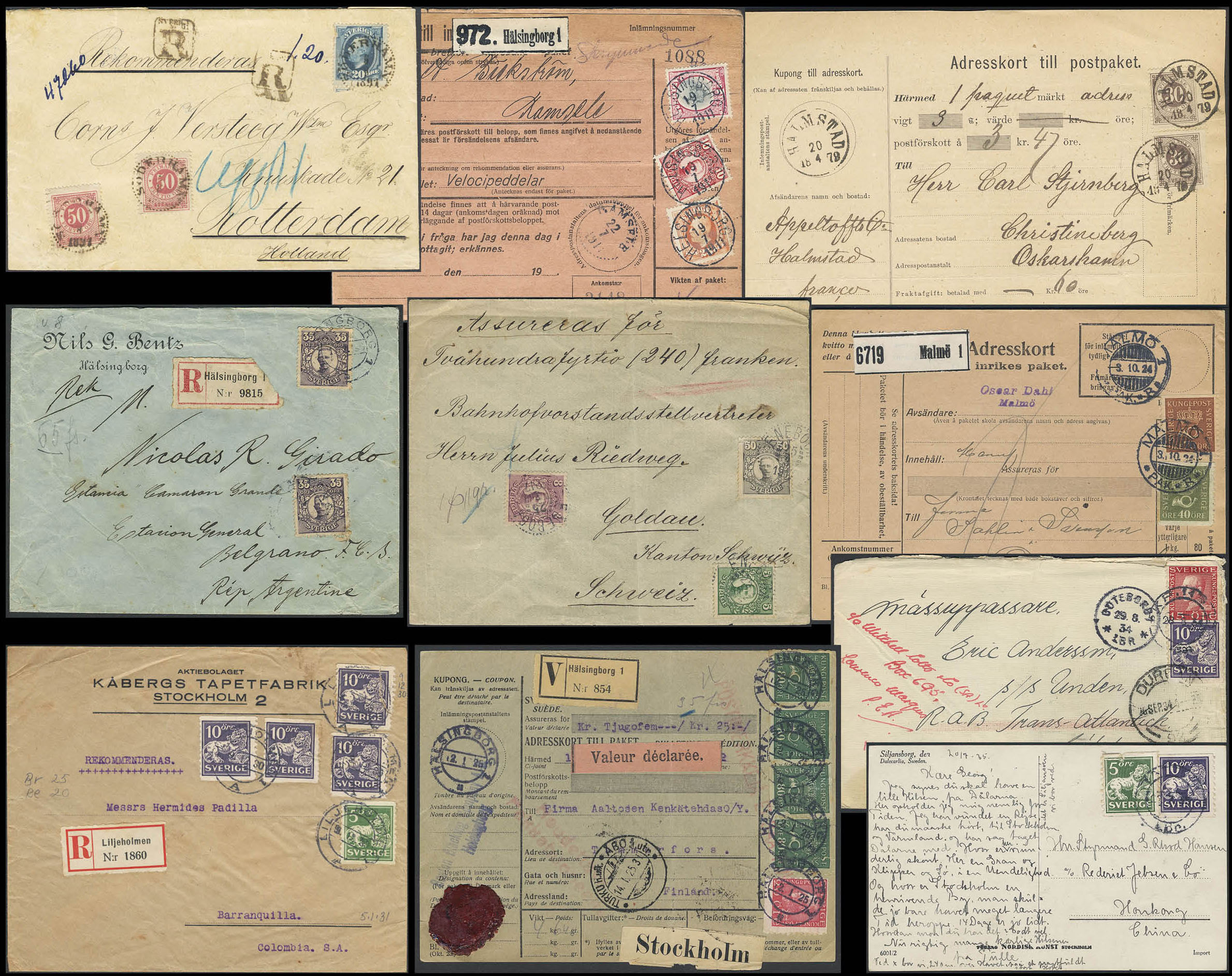 Sweden. Collection covers 1879–1925 on visir leaves. Selected better usages incl. an early address card for C.O.D. parcel, registered covers to Argentina and Colombia, insured covers to the Netherlands and Switzerland, address card for bulky parcel, etc. The entire lot is presented at www.philea.se. Somewhat mixed quality. (10)