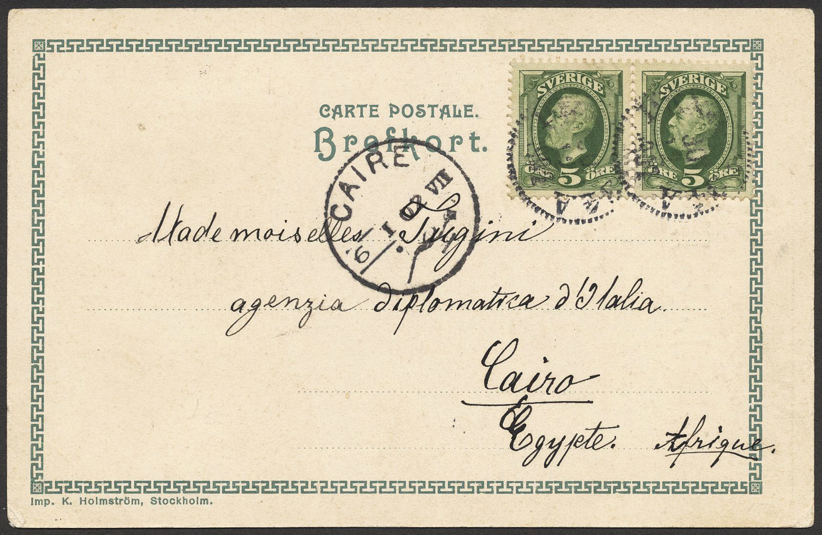Sweden. Collection covers OSCAR II on visir leaves. Mix of foreign destinations e.g. to Egypt, Japan Romania and South Africa, registered and insured covers sent to abroad, a money order sent to Denmark , an address card for insured parcel with mixed franking, etc. The entire lot is presented at www.philea.se. Somewhat mixed quality. (10)