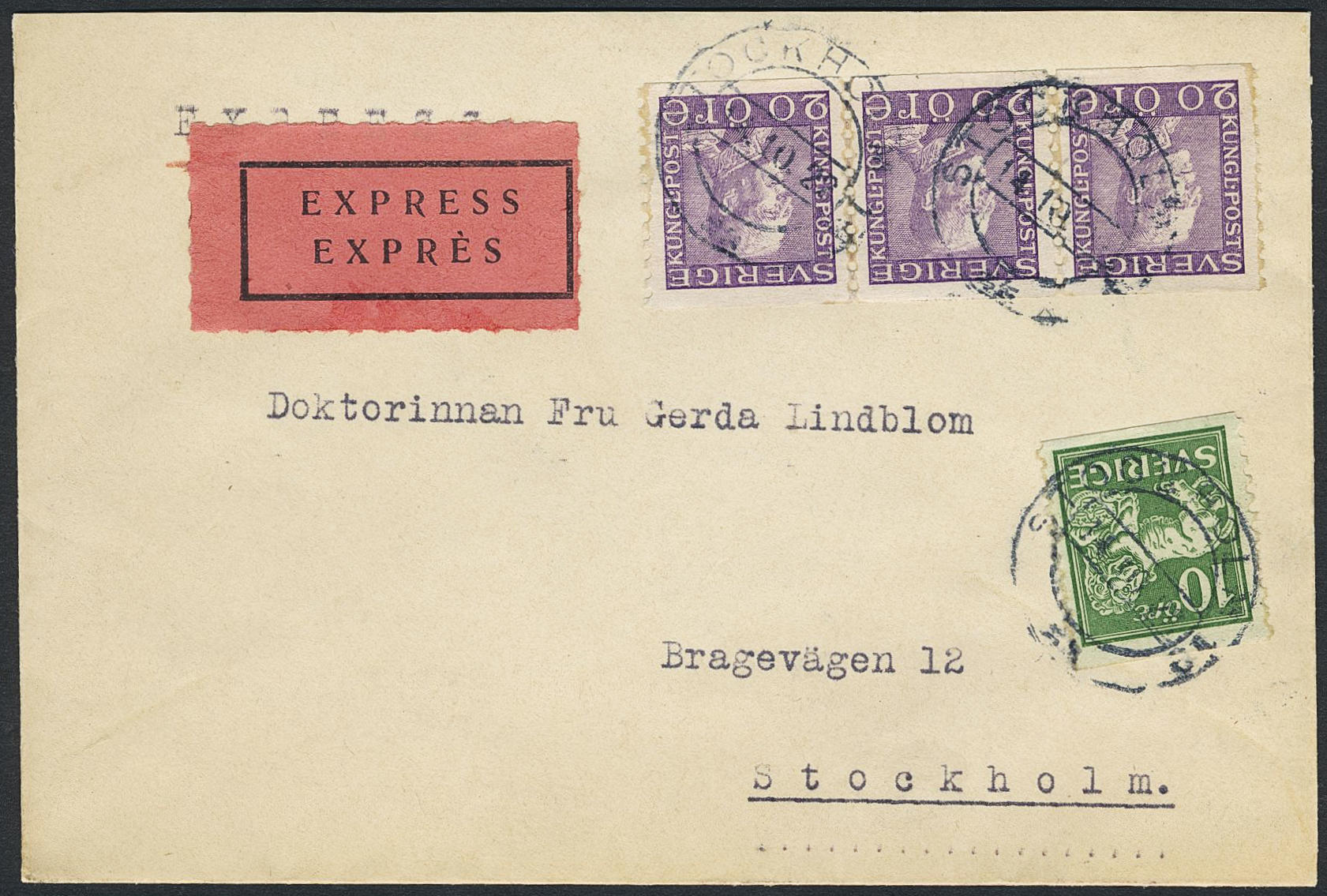 Sweden. Collection covers SPECIAL DELIVERY 1906–1942 on visir leaves. Combinations, together with other additional services, different labels, censor, etc. The entire lot is presented at www.philea.se. Somewhat mixed quality. (14)