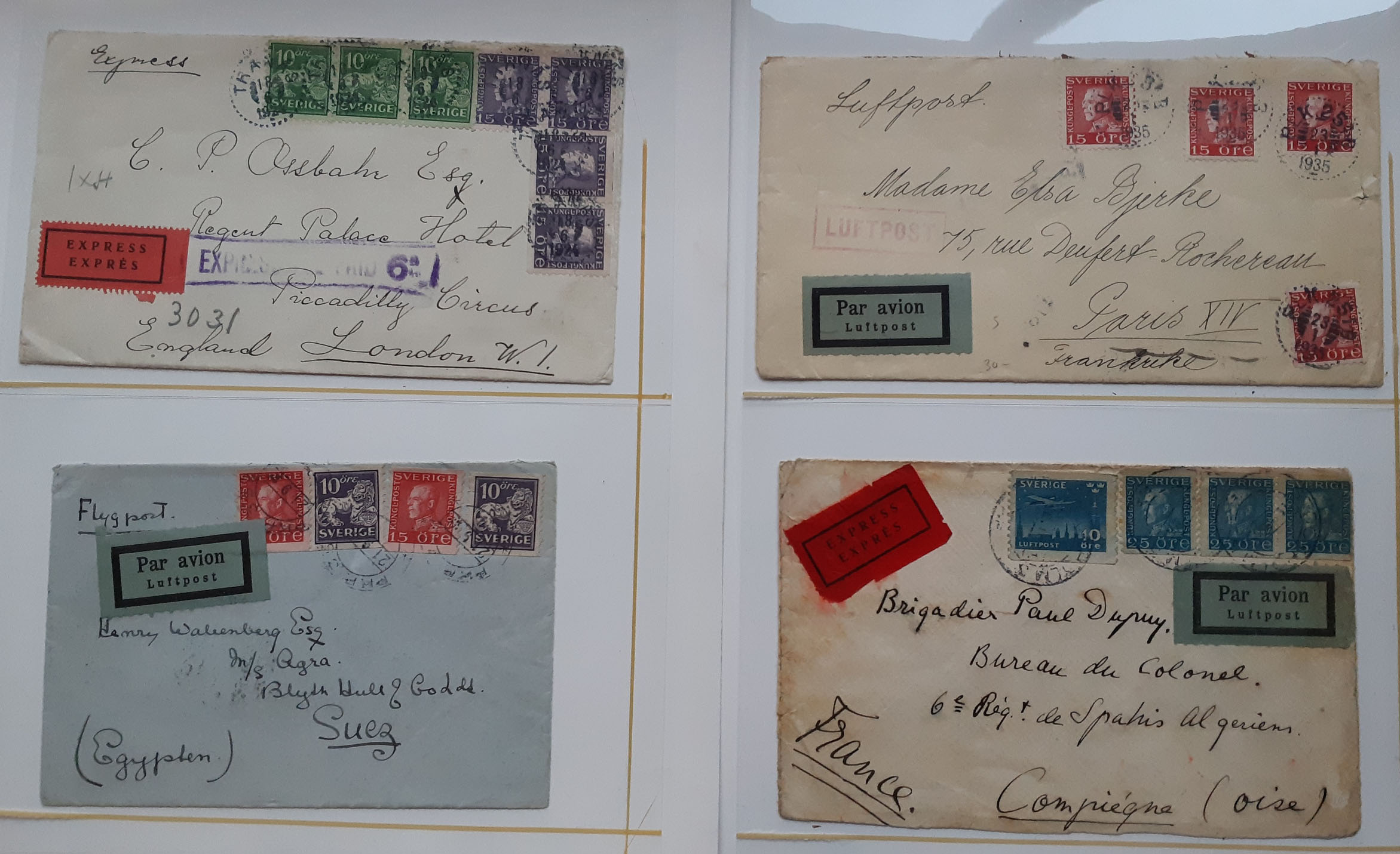 Sweden. Collection covers CROWN AND POSTHORN–GUSTAV V LEFT PROFILE on visir leaves. Better usages e.g. higher denominations, registered, insured, special delivery and air mail, etc. Mostly good quality. (15)