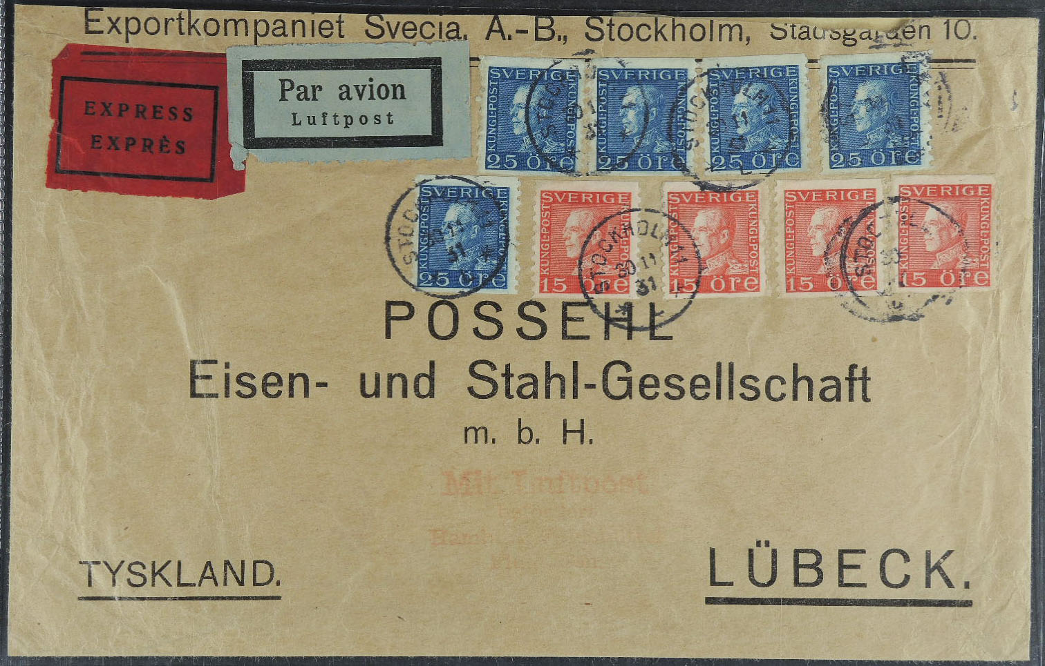 Sweden. Collection covers COIL STAMPS 1921–1936 on visir leaves. Nice mix of additional services, money orders incl. with return receipt, address cards sent to abroad, incl. C.O.D., form for address change for a newspaper, etc. The entire lot is presented at www.philea.se. (10)