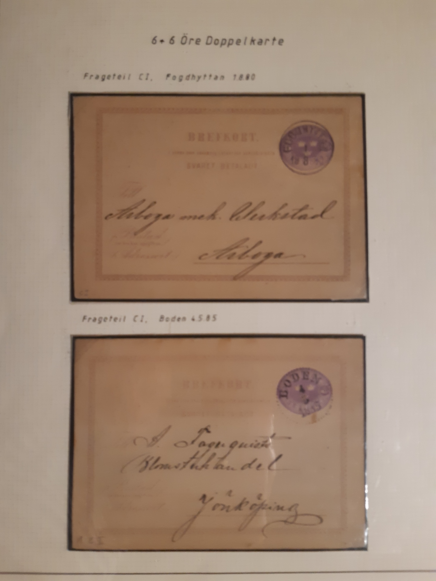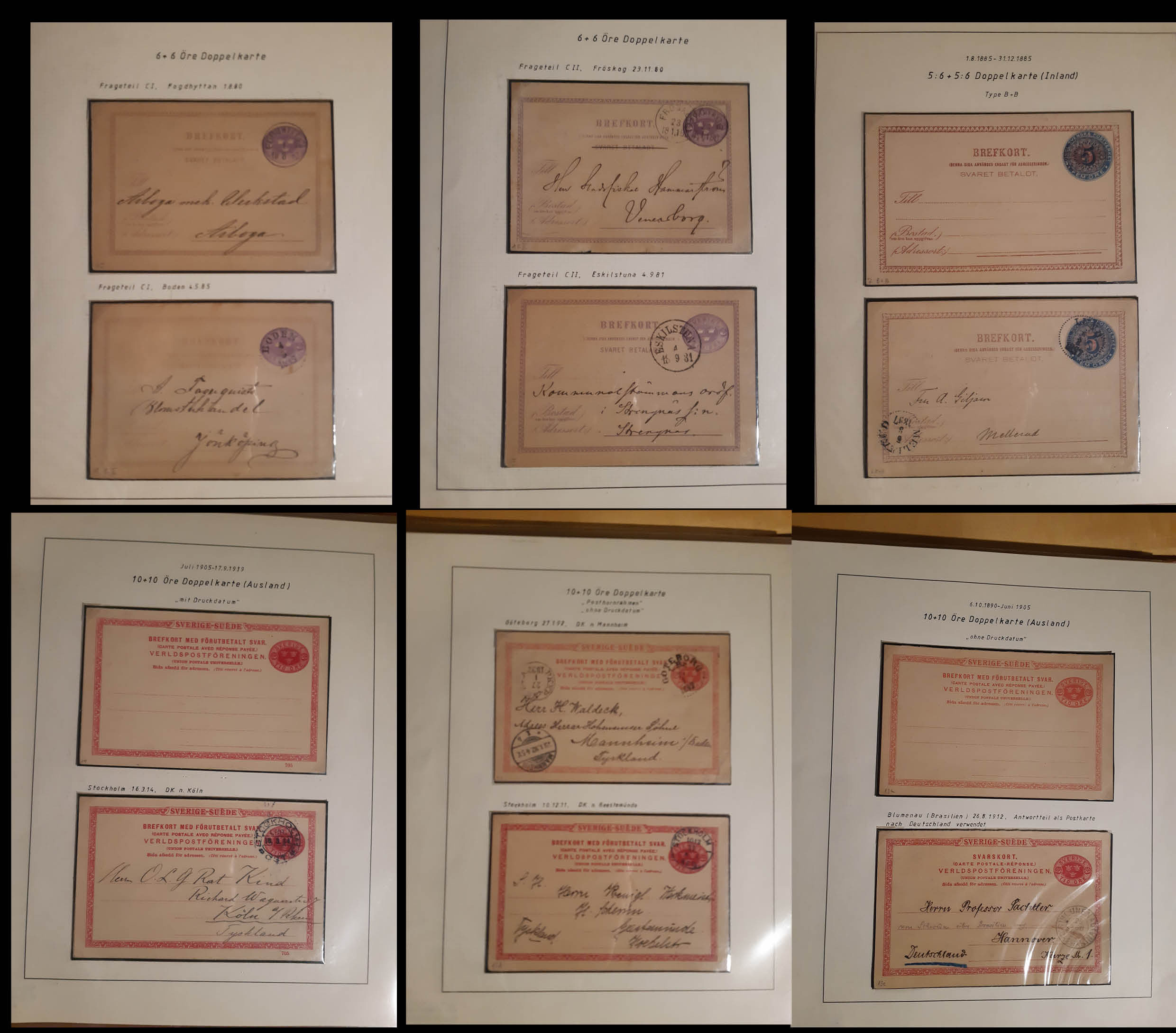 Sweden. Postal stationery, collection REPLY-PAID POSTCARDS 1873–1919 beautifully mounted in a Linder album. Unused and used examples in mostly very fine quality. E.g. bKd1CII+CII unused with slanting value stamp, two copies each of originating cards CI and CII, Bkd13 and 14 with some usages to abroad,etc. (48)