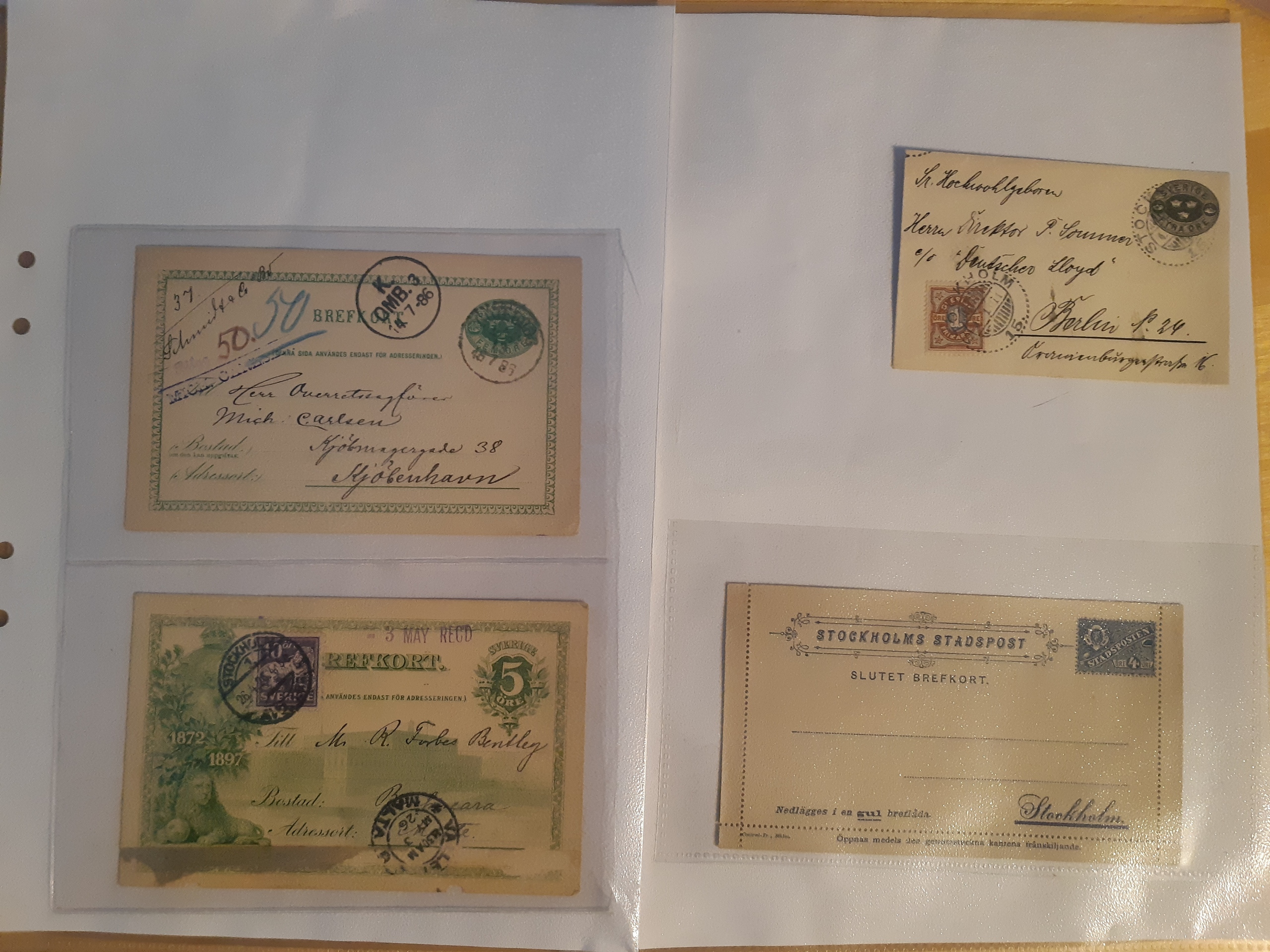 Sweden. Postal stationery, accumulation 1870s–1950s on leaves and in album in box. Mostly postcards, plus some letter cards and other, incl. much cancellations e.g. from smaller villages. A few better usages are included as well, e.g. a bKe6 without message and address, seemingly posted in letter box, cancelled HALMSTAD 3.2.1895 and OBESTÄLLBART (undeliverable) and one bKe9 (with imperfections) sent to Malta. Also a few official and military issues and some later ones as well. Much to look through. Approx. 11 kg. (1300)