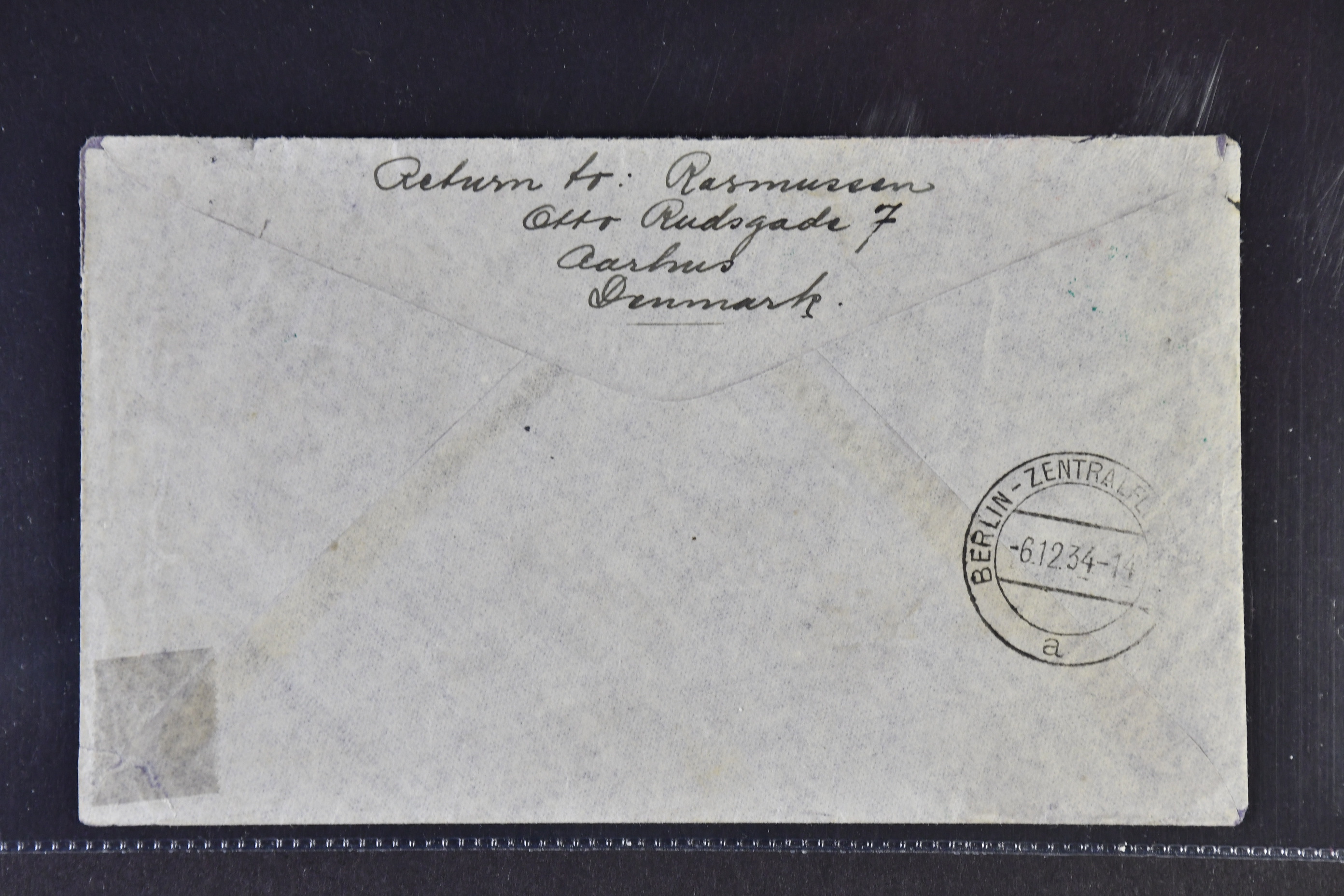 Denmark. Facit 229a, 259 on cover, on Zeppelin cover Christmas flight to South America 1934, AARHUS 5.12.34 to Argentine, small tear in lower right corner.