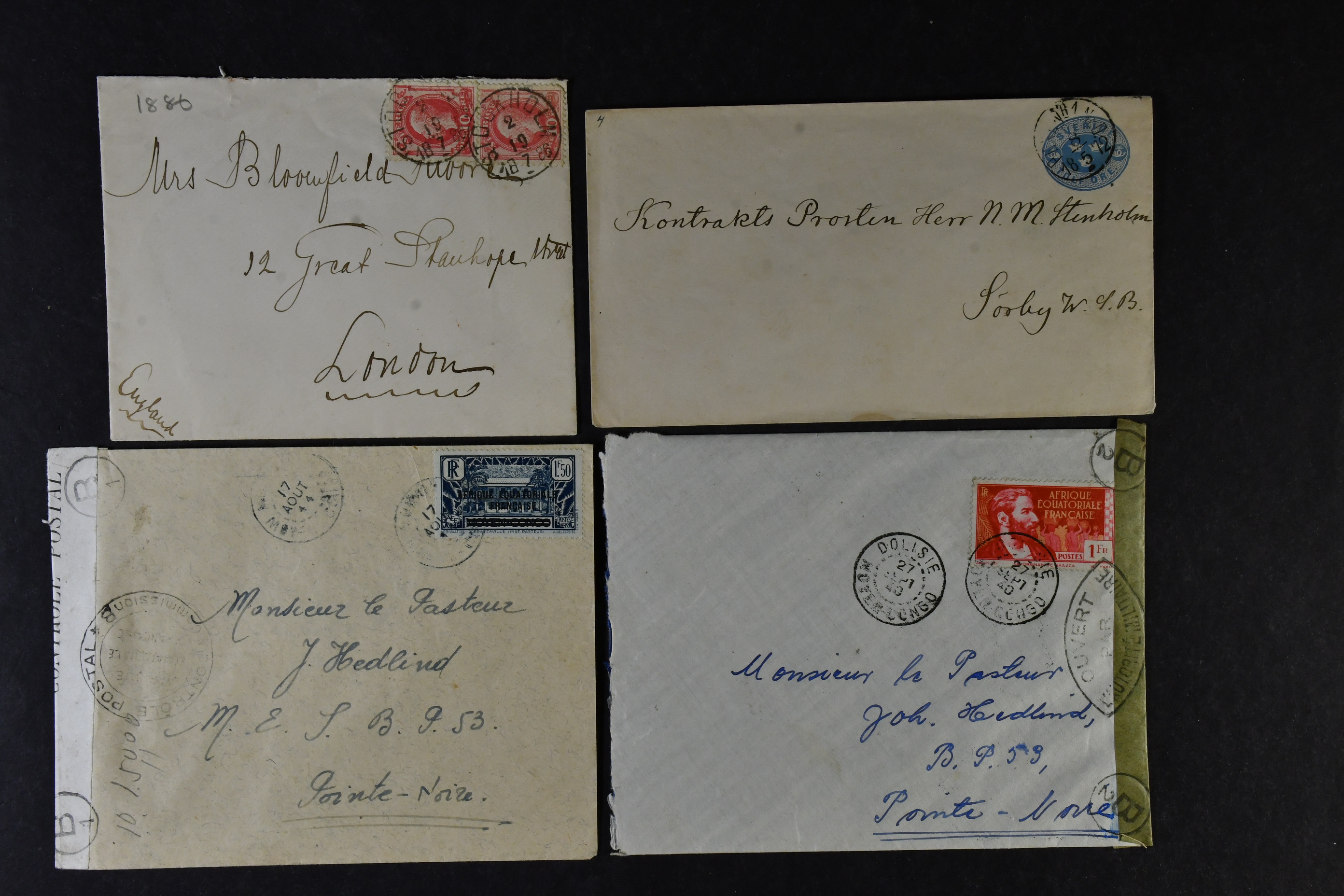 ALL WORLD. Lot covers 1856–1944. Sweden incl. one postcard sent to China in 1911, plus French Equatorial Africa censored covers sent to Pointe Noire. The entire lot is presented at www.philea.se. (12)