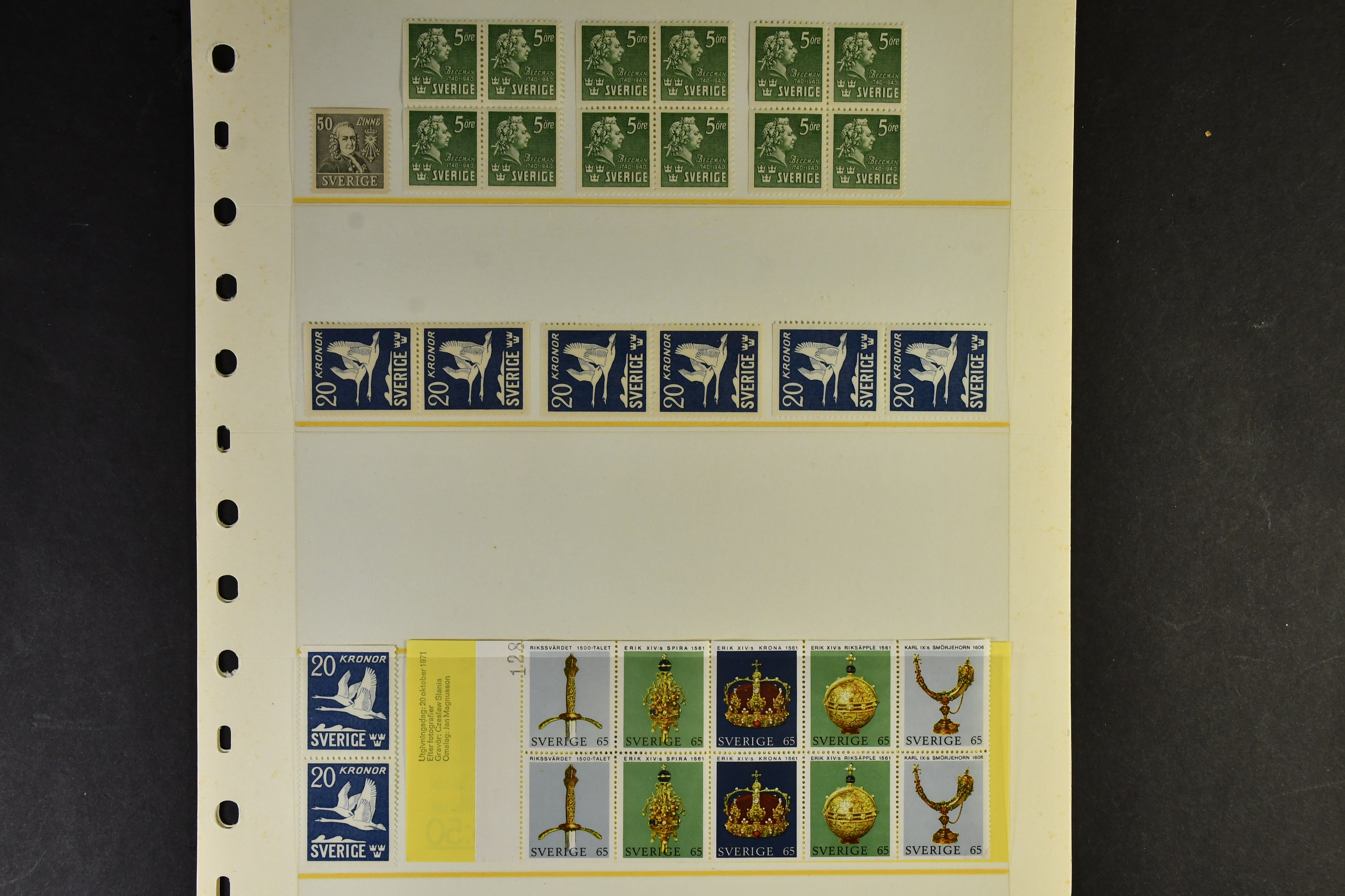 Sweden. Collection ★★ 1930s–1940s on visir leaves. Better stamps incl. several BC/CB-pairs, partly in blocks. Also one booklet H248 with variety part of control number on one stamp (cover with minimal handling traces). Very fine quality. 25690 (78)
