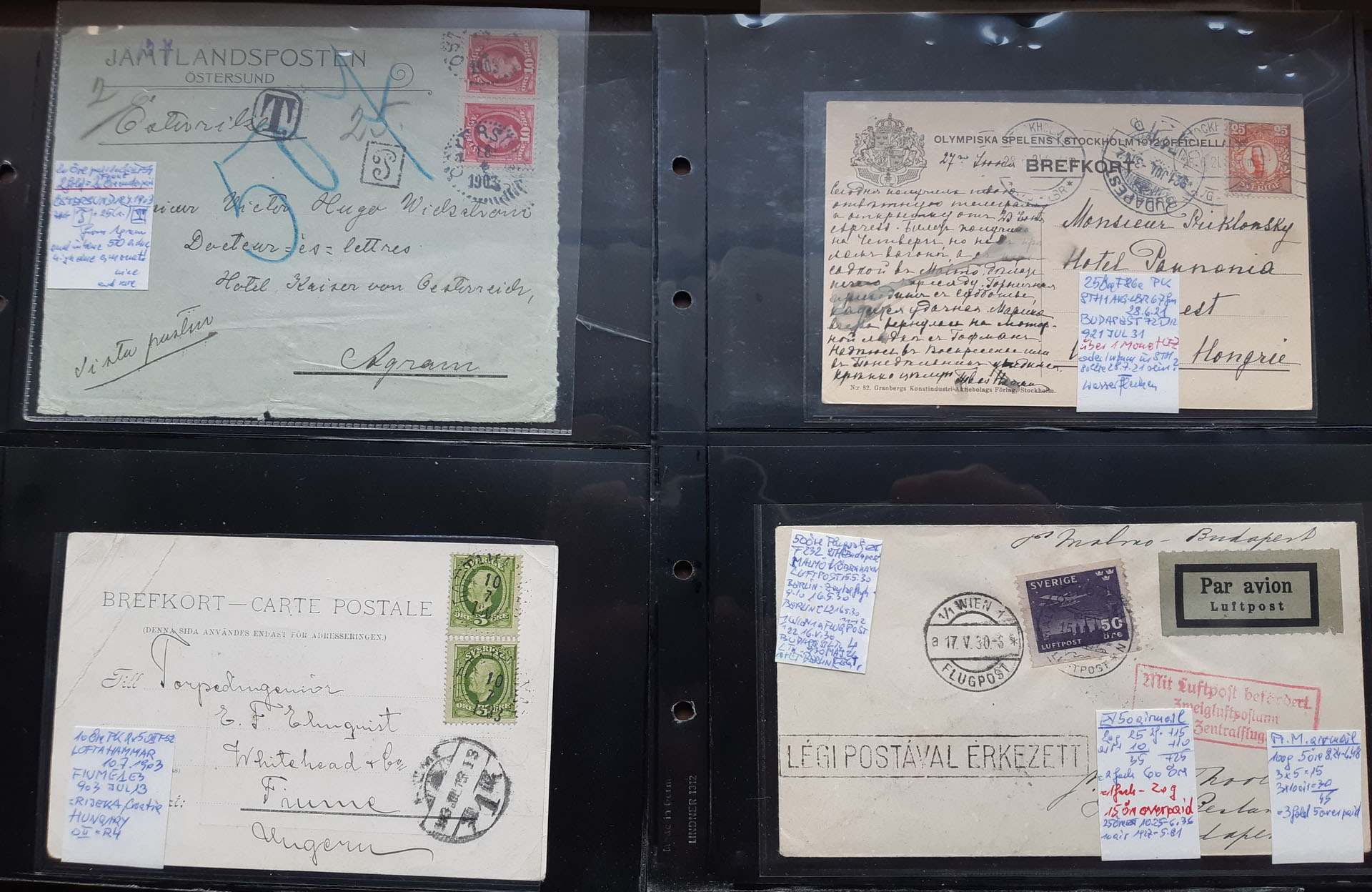 Sweden. Collection covers SWEDEN–HUNGARY 1895–1943 on visir leaves. Interesting mix of items incl. postage due, air mail, currency control, etc. to a better destination. The entire lot is presented at www.philea.se. Ex. Michtner. Mostly good quality. (19)