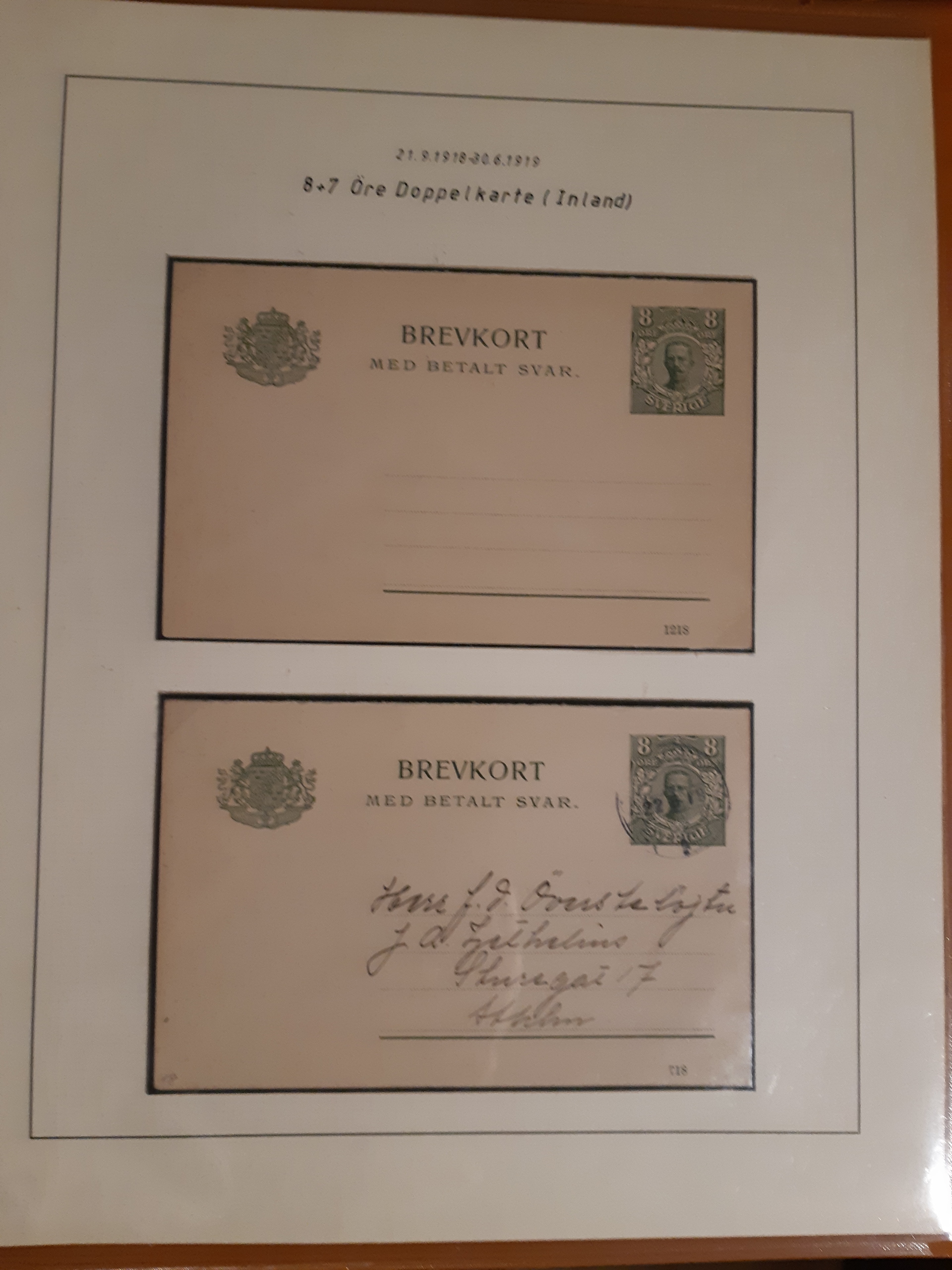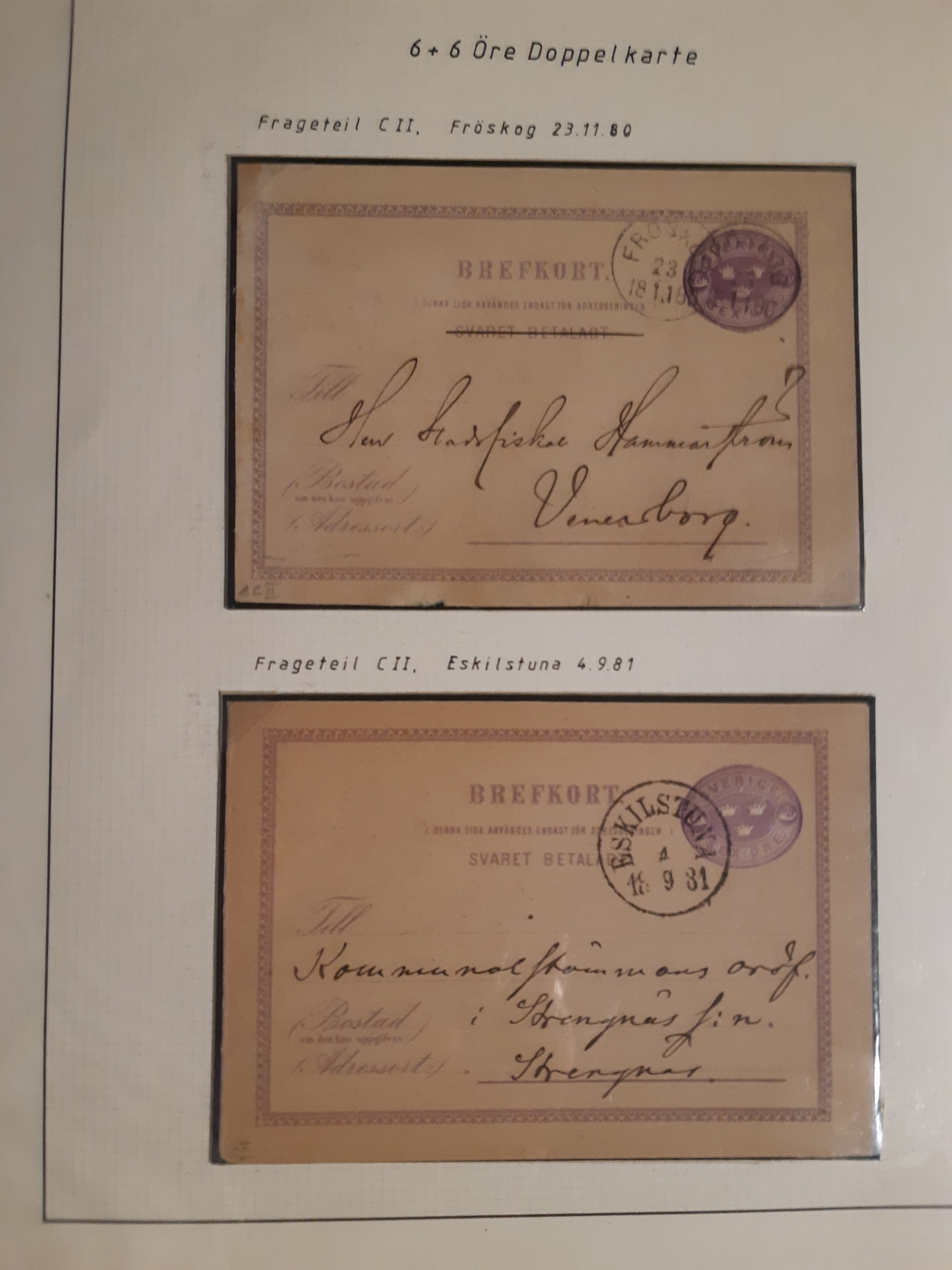 Sweden. Postal stationery, collection REPLY-PAID POSTCARDS 1873–1919 beautifully mounted in a Linder album. Unused and used examples in mostly very fine quality. E.g. bKd1CII+CII unused with slanting value stamp, two copies each of originating cards CI and CII, Bkd13 and 14 with some usages to abroad,etc. (48)