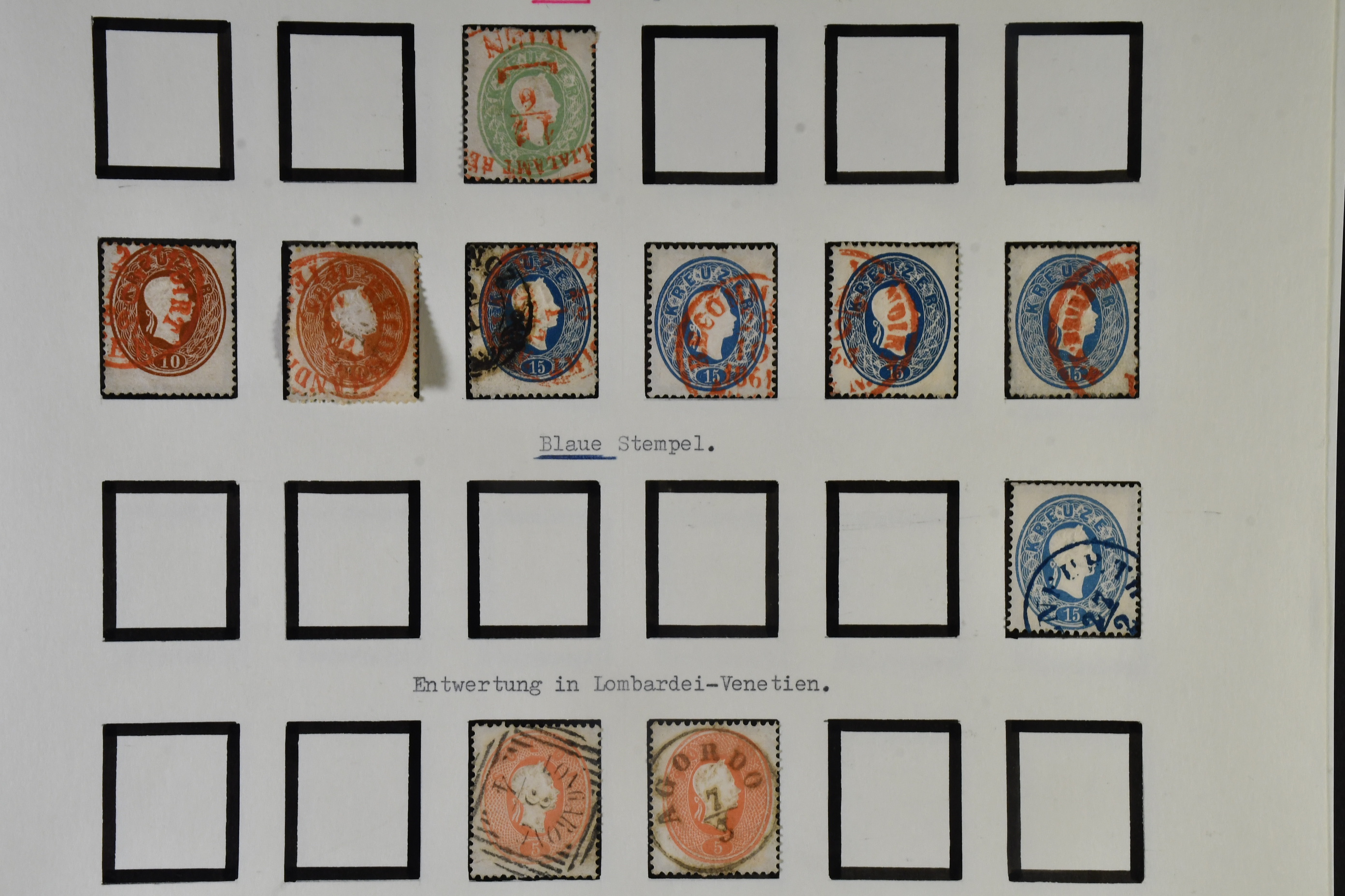 Austria. Collection used 1850s–1883 on 16 home made leaves. CANCELLATIONS, very interesting study various issues in the period with e.g. blue and red cancellations, many nice town cancellations, etc. The entire lot is presented at www.philea.se. Fine quality.