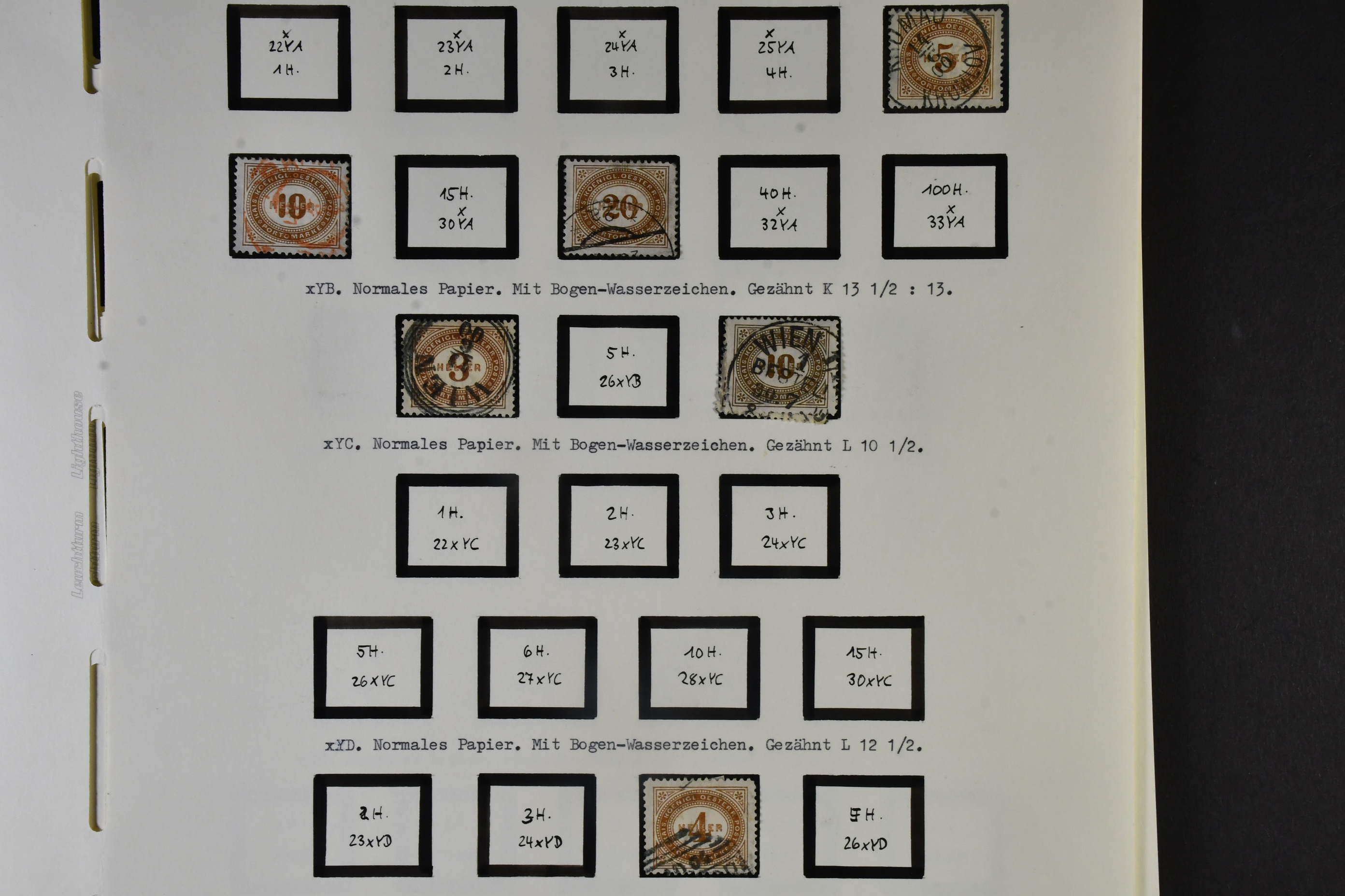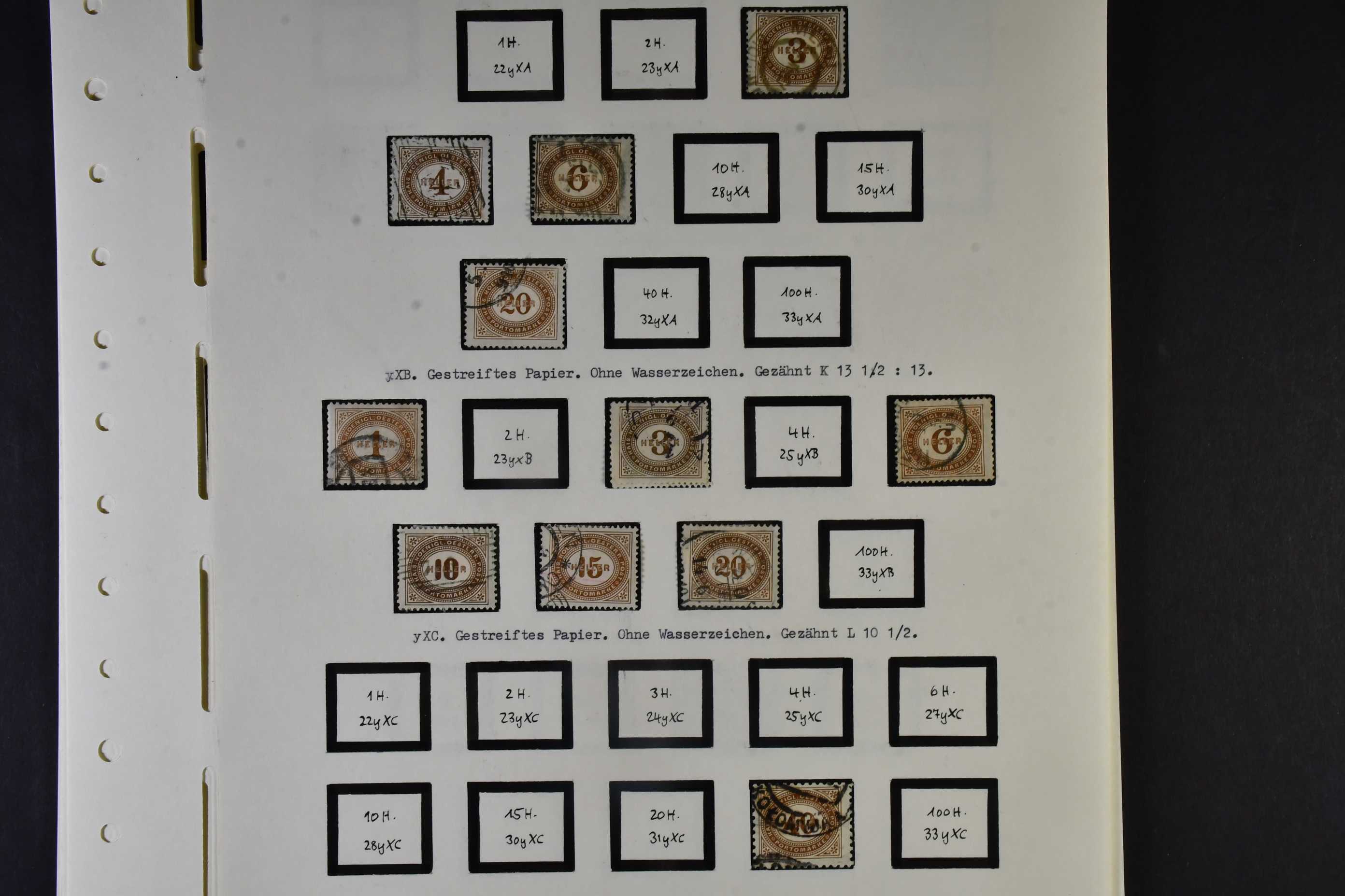 Austria. Collection mostly used 1894–1935 on 22 home made written-up leaves. DUES, nice and comrehensive collections incl. stamps with perforation varieties incl. imperfs, different cancellation colours, better/higher values, etc. A nice lot for the specialist. The entire lot is presented at www.philea.se. Fine quality.