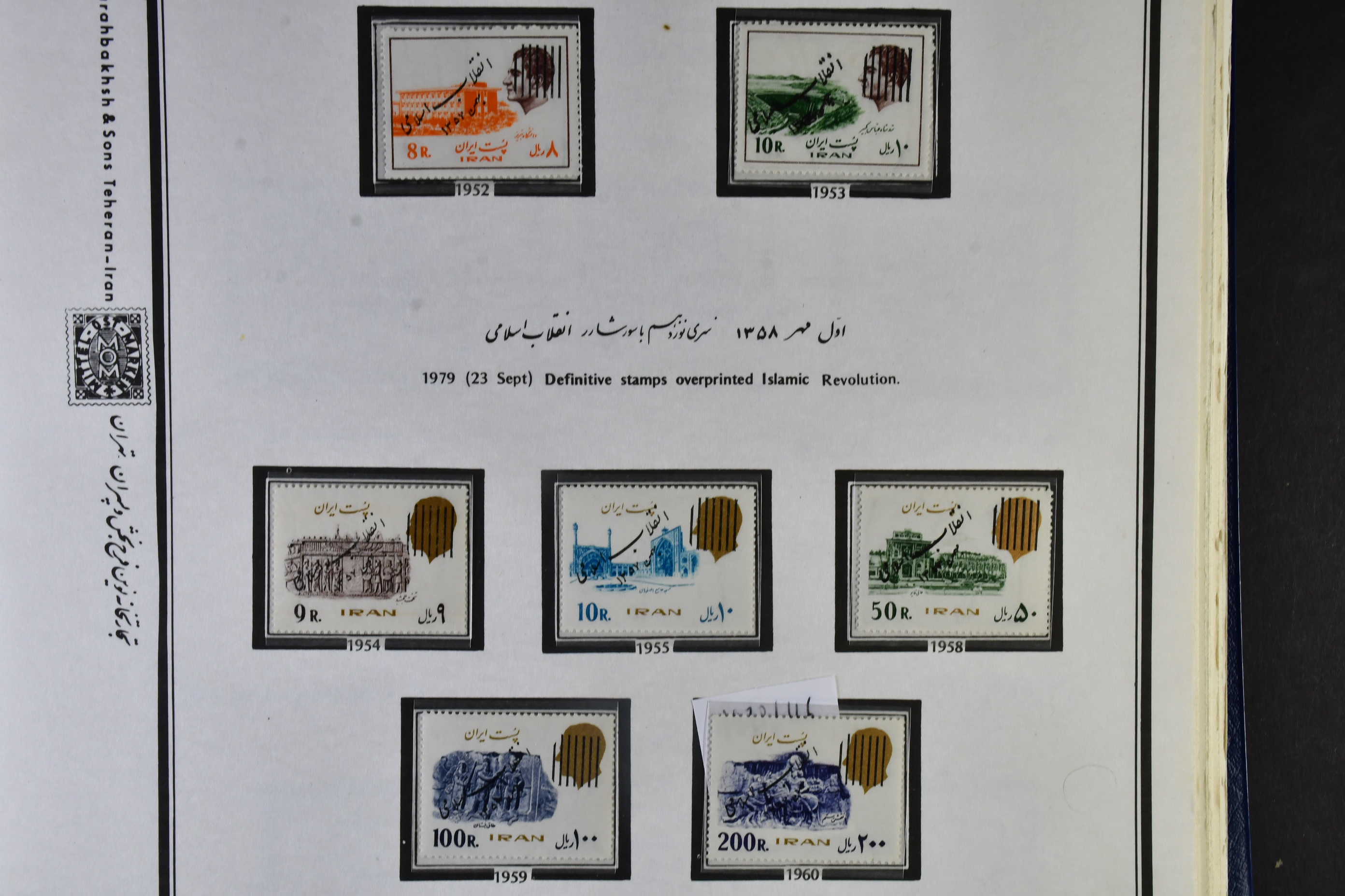 Iran. ★★ 1979–1991. An extraordinary complete collection, beginning with the revolutionary period, housed in one large album specifically made in Tehran. Beginning with the Shah's head obliterated definitive o/ps for the new regime, from the late 1970s all the way through to the early 1990s including miniature sheets. The definitives with se-tenants and imperfs, also the banned (in US) anti-American issues and much more saturated with all the culture and propaganda of the Islamic Revolution. An absorbing collection to view, no doubt with scarce material present from the low printing numbers and the lack of worldwide new issue distribution. An opportunity.