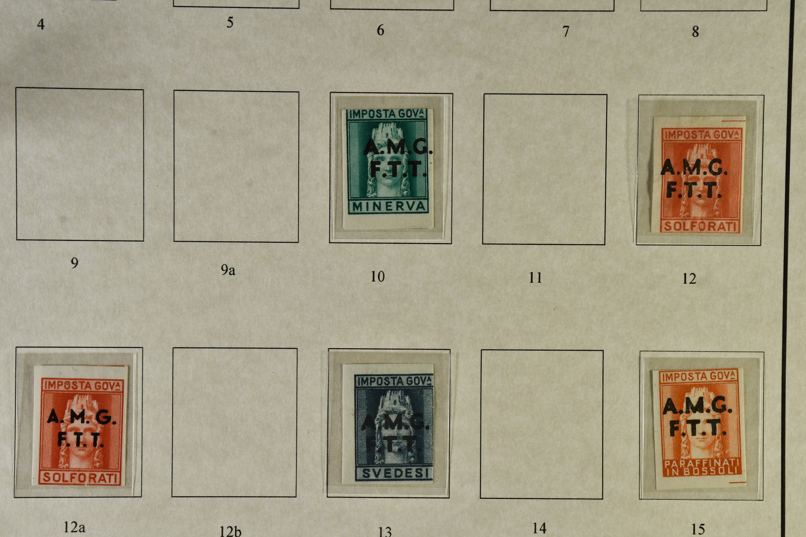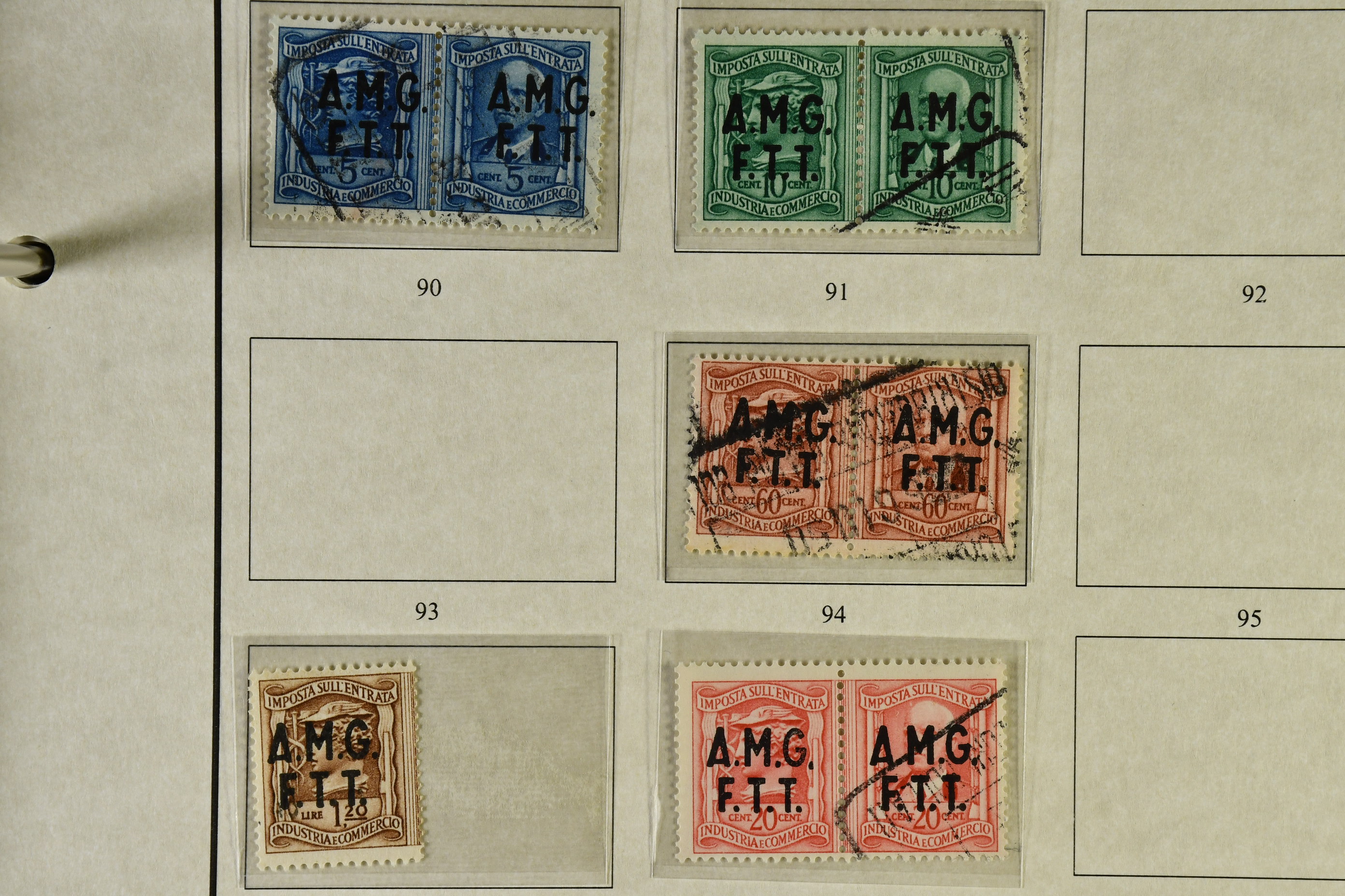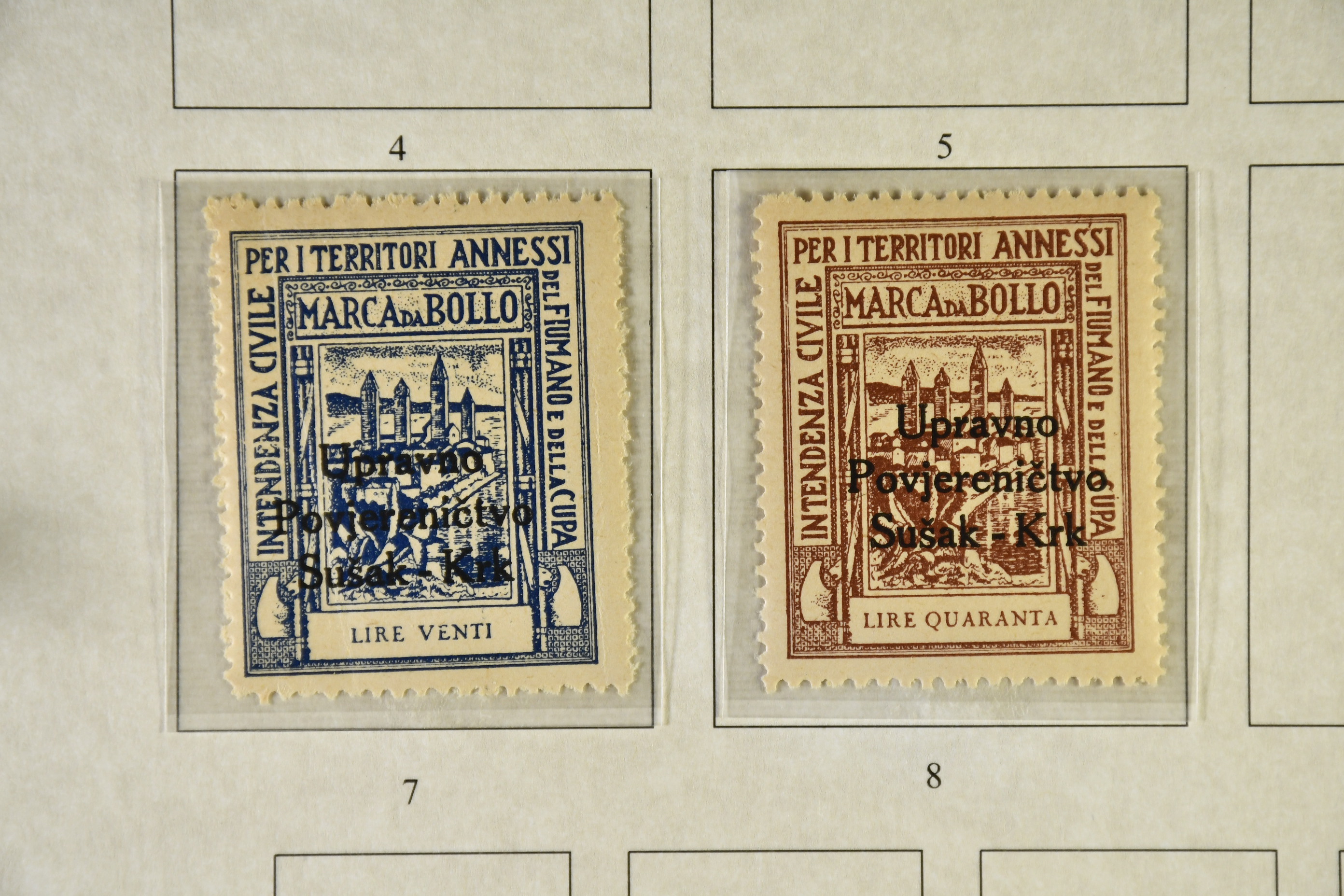Italy. ★★/★/⊙. Specifically Fiume and Trieste, one man's life time collection of back of the book. Several 100s of stamps, housed in one thick album very well presented, written up, all one of a kind with much identified by Barefoot. Beginning with Fiume from the Croatian Occupation through to the Italian printings, then the 'Marco da Bollo' o/ps to further Fiume o/ps with different stars and watermarks, overprint errors, as well as other unlisted. Virtually every issue seen for any purpose for Fiume such as stock transfers, passports, municipals, even Istria, Kupa-Sudsk onto WW2 types, very seldom seen. Similarly with the Partisan Government issues of Susak and equally scarce Kupa issues inc multiple pairs particularly for excise duty. Then the 'Diritti D'Urgenza' Venezia Guila, on to the free territory of Trieste with inter-panneau pairs through to AMGs, again very well represented, seemingly complete. Also noted Bills of Exchange, cigarette papers, stock transfers se-tenants, security papers in pristine condition, further se-tenants including large pictorials through to Romulus types and on to yet further errors and varieties, nearly all of it MNH, followed by 'weights and measures' with dramatic horizontally misplaced o/ps with the distinct probability of unique items present. So much here to research than this outline description. This collection is important, some material is quite exceptional. A most enjoyable viewing awaits the collector or dealer looking for the different and very scarce, offered intact as received.