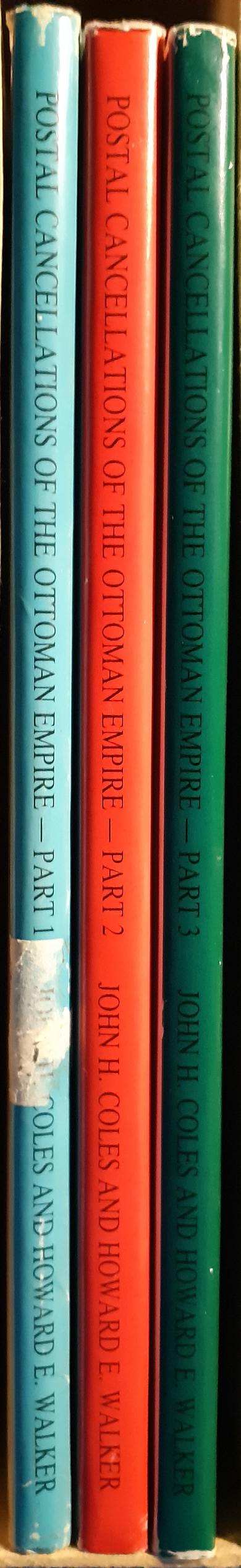 Literature, Ottoman Empire. 'Postal Cancellations of the Ottoman Empire', Coles, Walker, Christies-Robson Lowe, 1990. Part I, Part 2 and Part 3 in three hardbound volumes. With illustrations and rarity information. In total 303 pp. Used, with dust jackets somewhat worn and one with traces of attached label.
