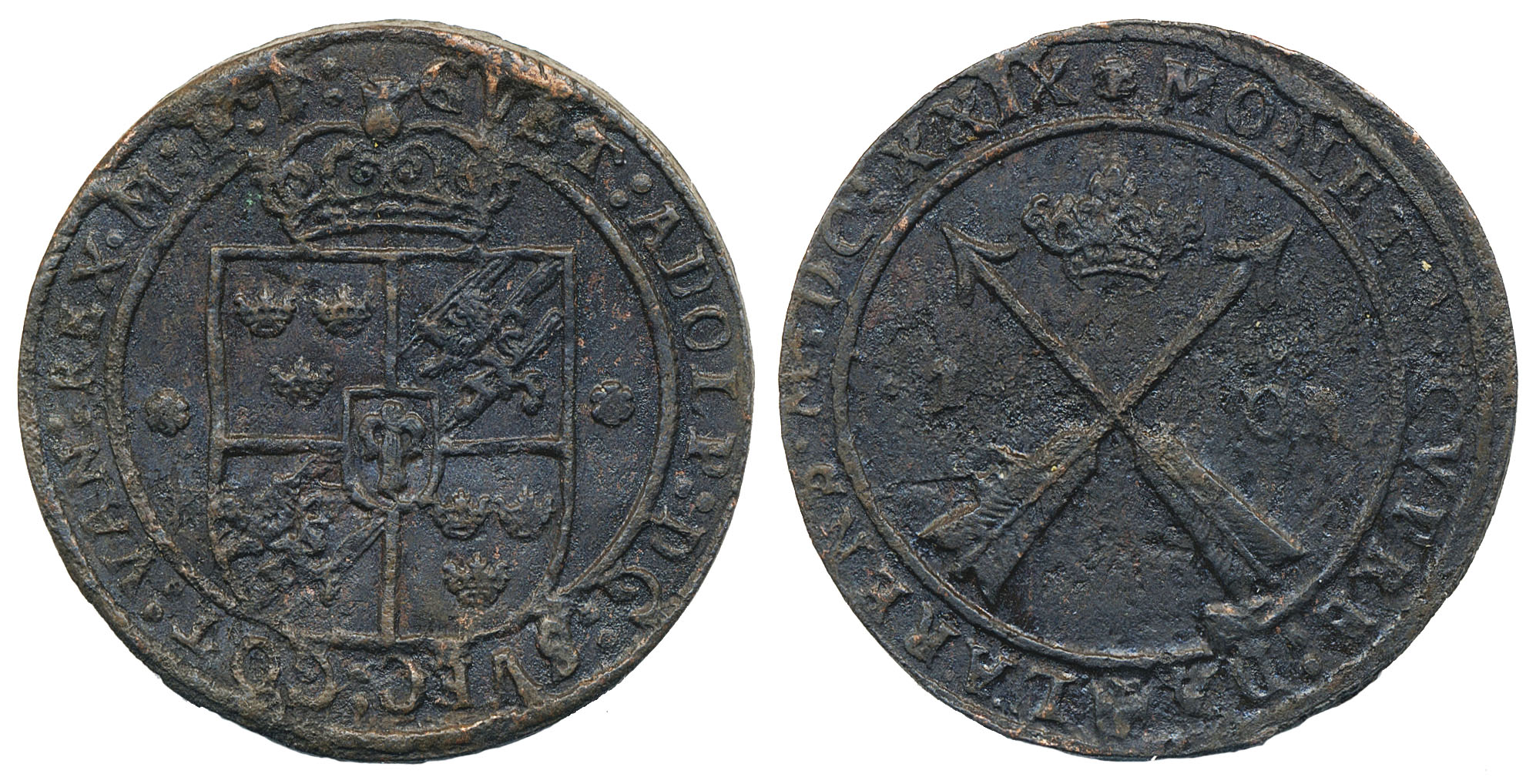 Coins, Sweden. Gustav II Adolf, SM 168a, 1 öre 1629. 27.54 g. Säter. Dalarens. Straight shield without ornaments, and roses in fields. Scarce. Some corrosion. SMB -. 1+.