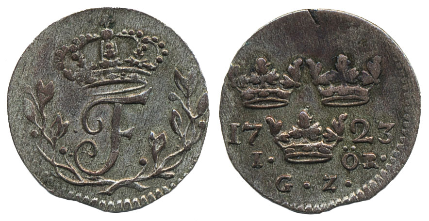Coins, Sweden. Fredrik I, SM 160a, 1 öre 1723. 1.18 g. Stockholm. SMB 166. 1/1+.