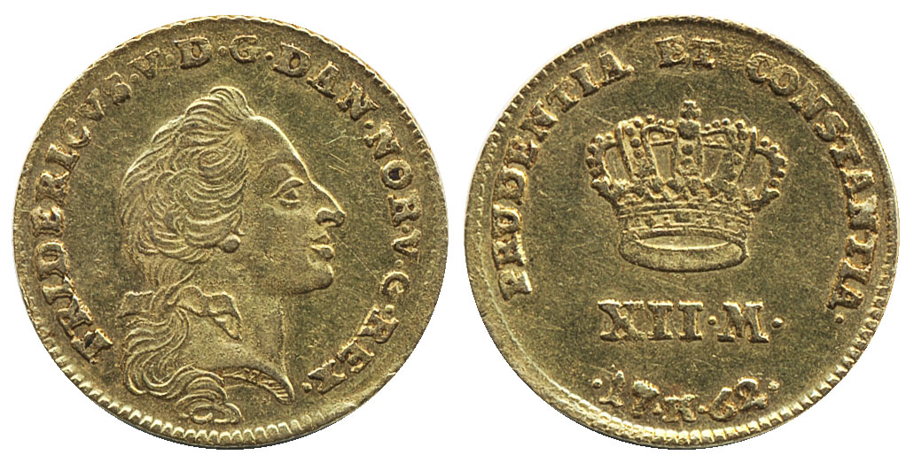 Coins, Denmark. Frederik V, Sieg 21.5, 1 kurantdukat (12 mark) 1762. 3.14 g. Hede 22. 1+.