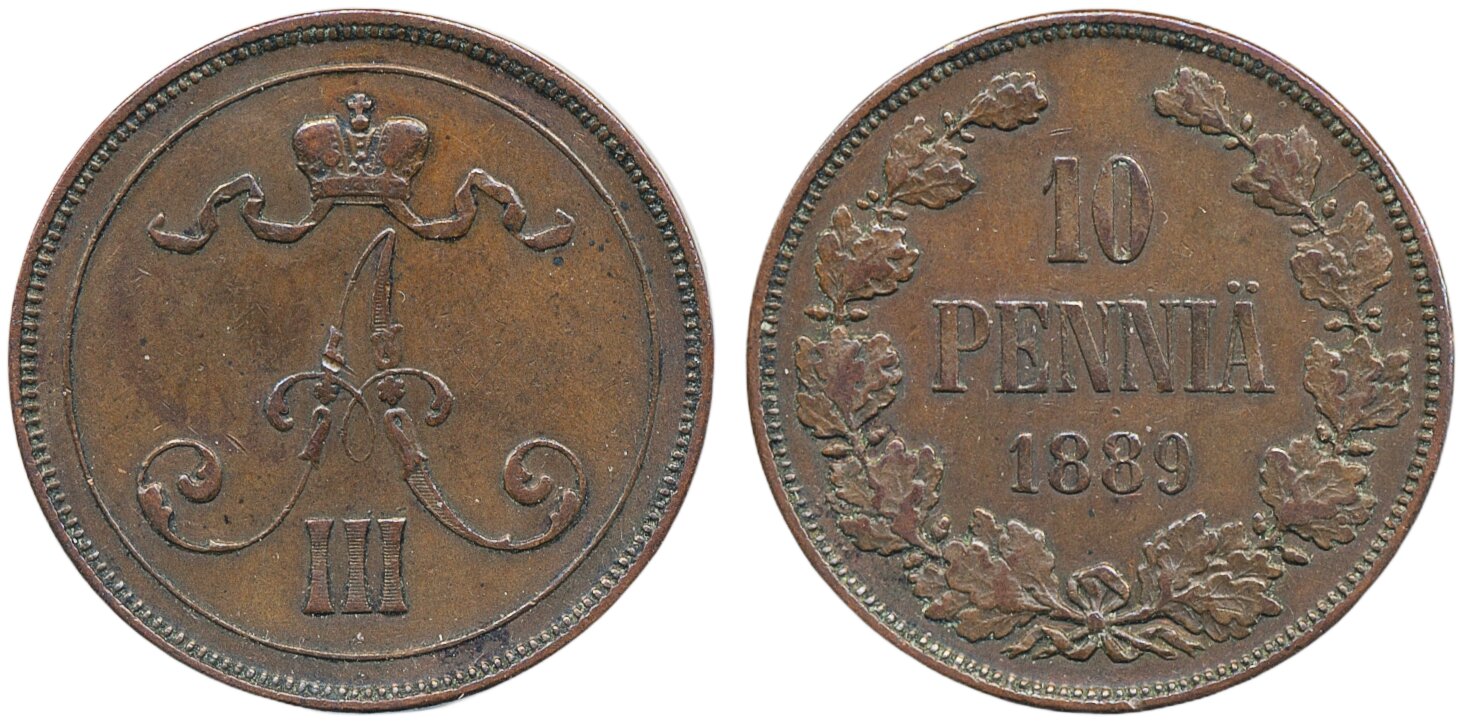 Coins, Finland. Alexander III, KM 12, 10 penniä 1889. 1+.