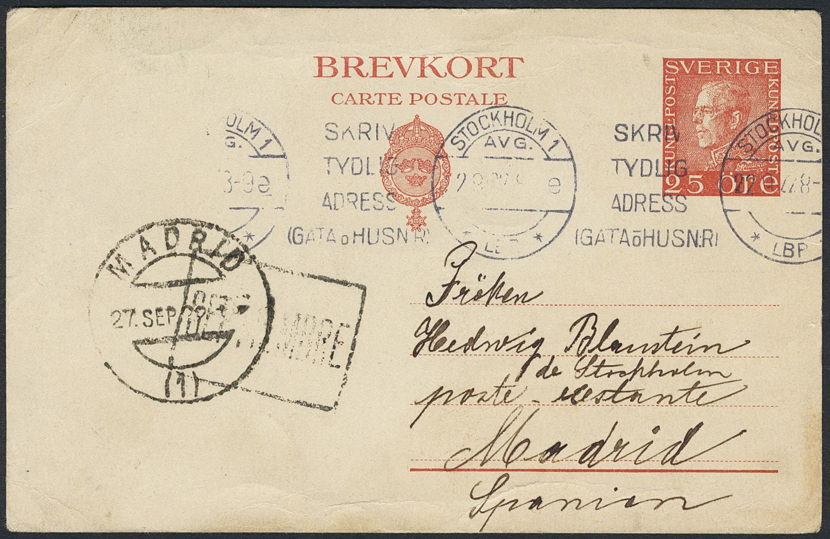 Sweden. Postal stationery, Single postcard, Facit bKe27, Postcard 25 öre sent from STOCKHOLM 1 22.9.22 to Spain. Arrival pmk MADRID 27.SEP.22.