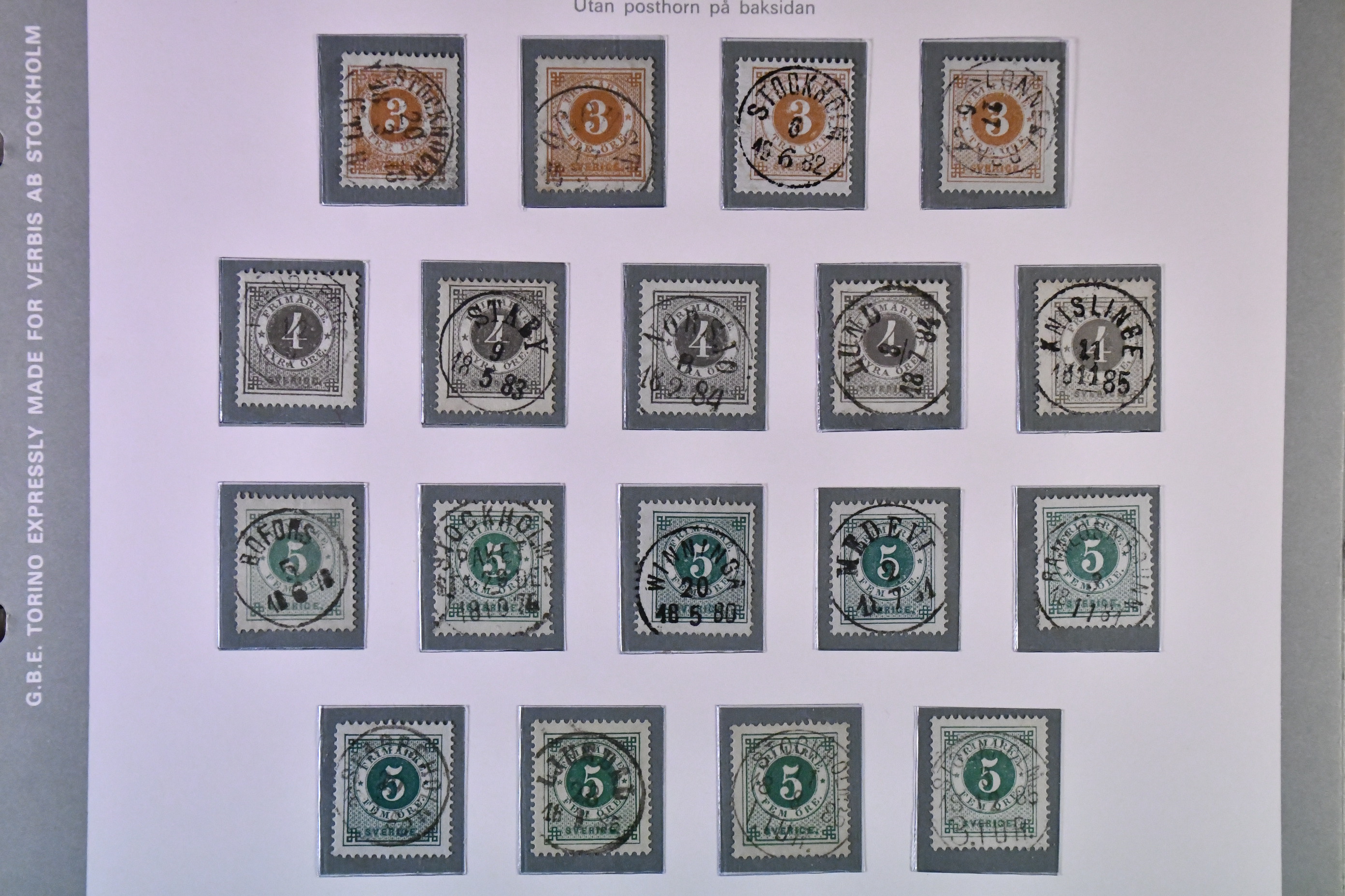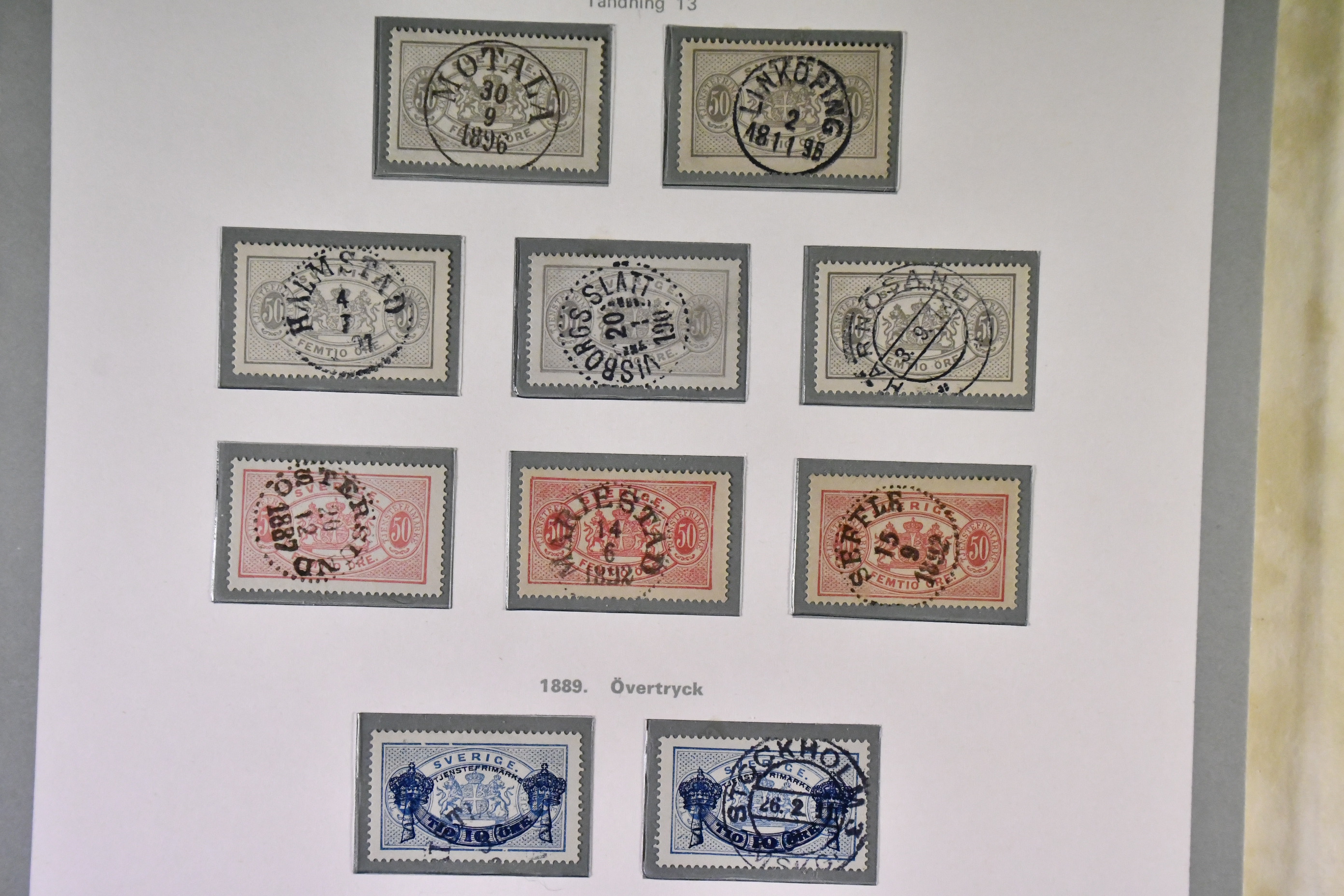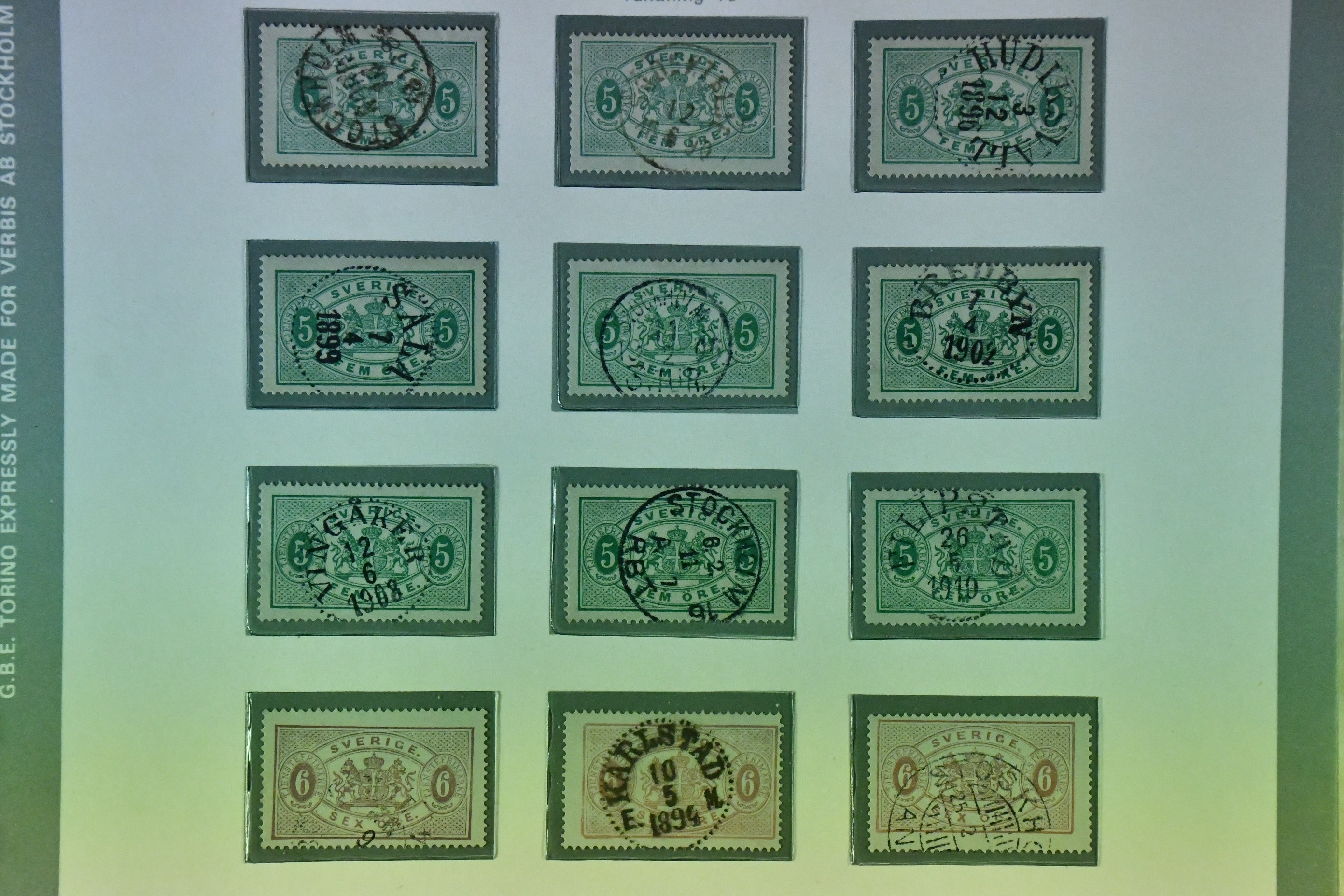 Sweden. Collection used 1855–1936 in album. Over complete (except F92 and 94) – the classic part often in several copies incl. different shades e.g. 4 Skill Bco in 17 copies, F15c and coil stamps with different wmks e.g. F175Acx. Also officials, postage dues and military reply-stamps. Many beautiful stamps. Six certificates are included. Mostly good quality.